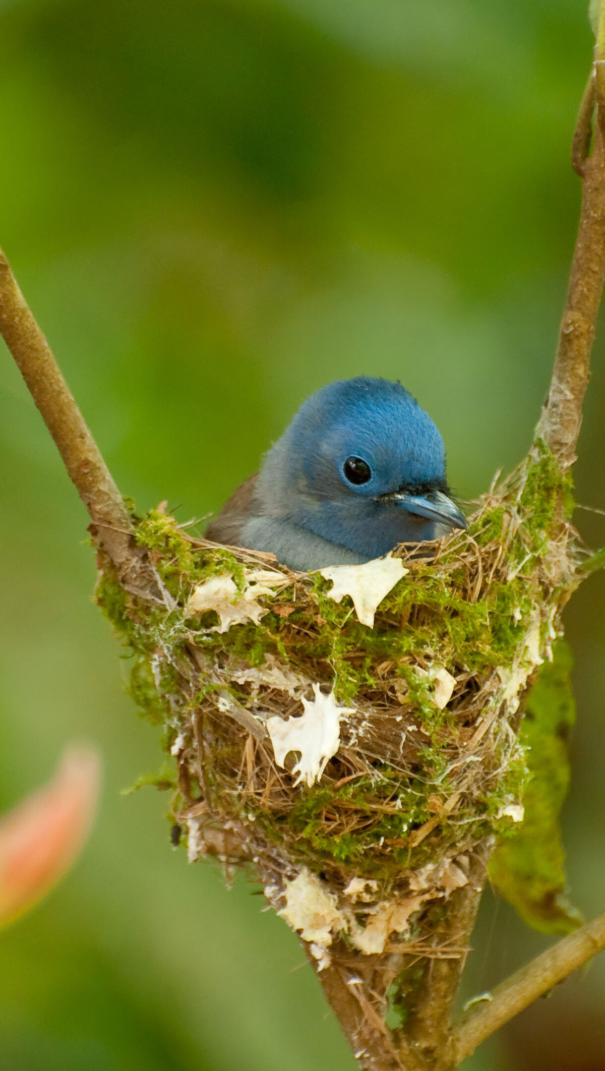 A captivating 4K wallpaper featuring a female Black-naped Monarch nesting within a small, moss-lined structure on a slender tree branch, surrounded by lush green foliage. Its striking blue head and watchful dark eye stand out against the soft, earthy tones of its meticulously crafted nest and the softly blurred, verdant background, evoking a sense of tranquil guardianship.