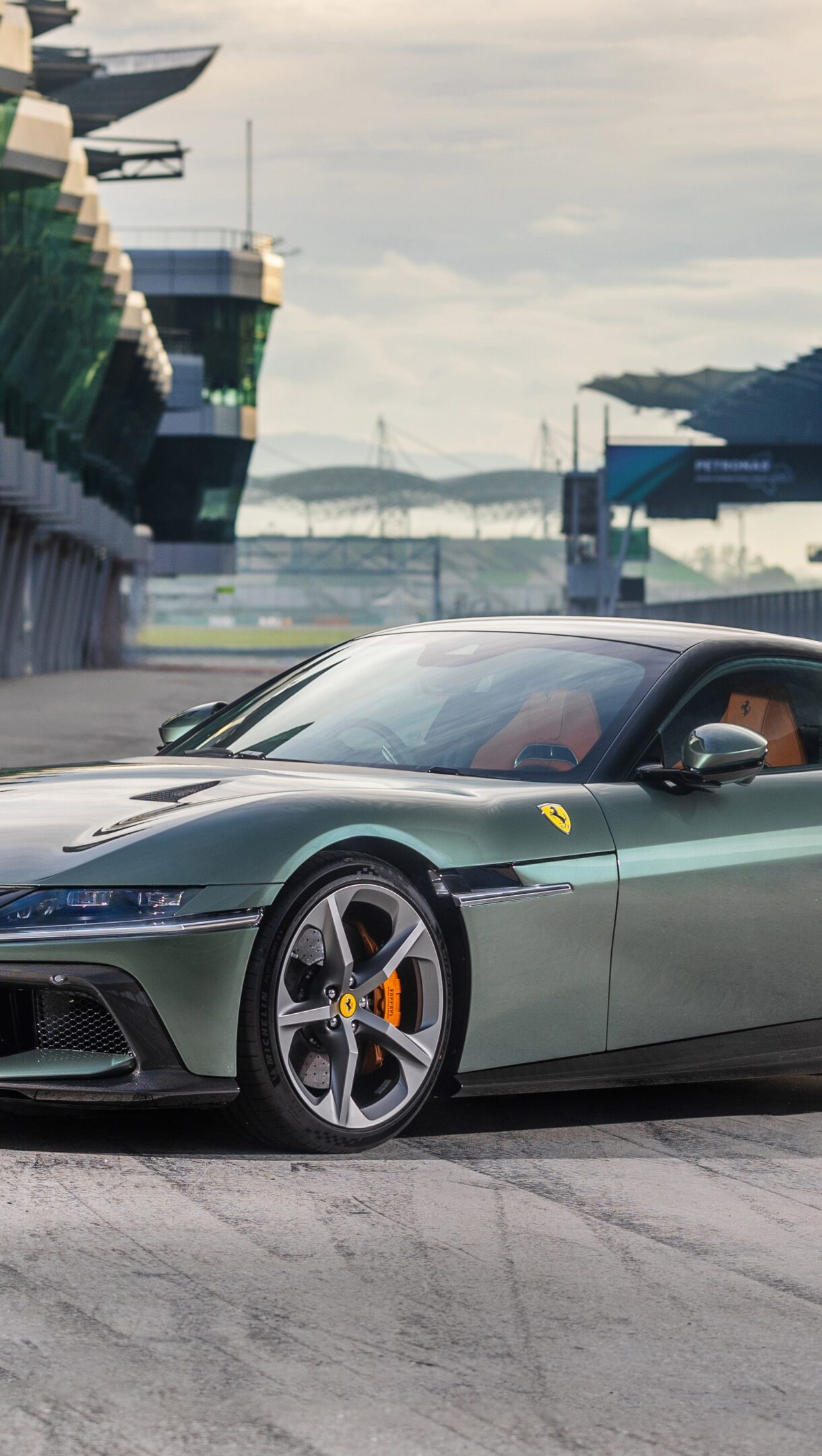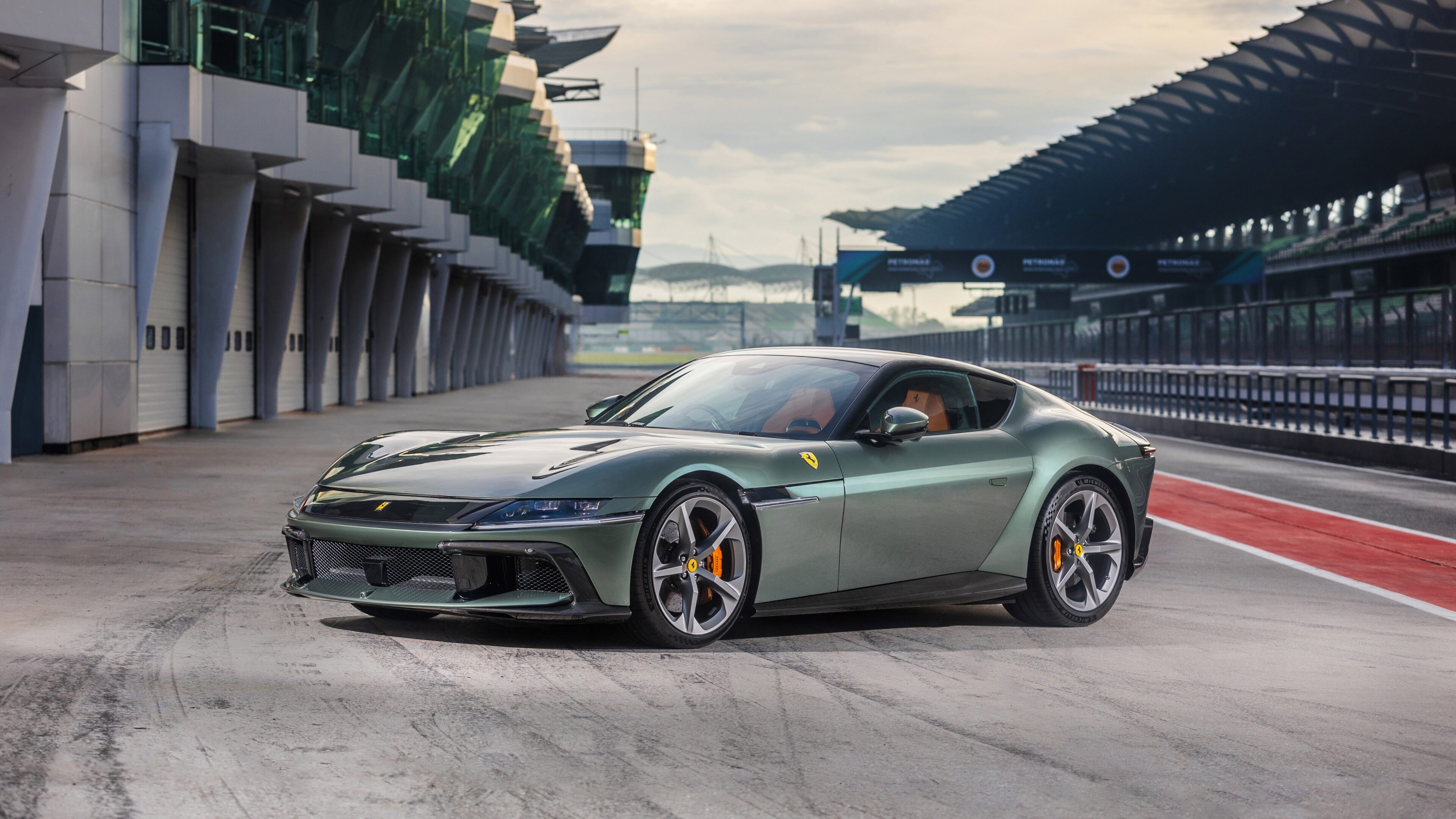 A stunning 4K wallpaper featuring the Ferrari 12Cilindri in Malaysia, showcasing its sleek design and powerful presence. The high-resolution image captures the car against a scenic backdrop, perfect for automotive enthusiasts.