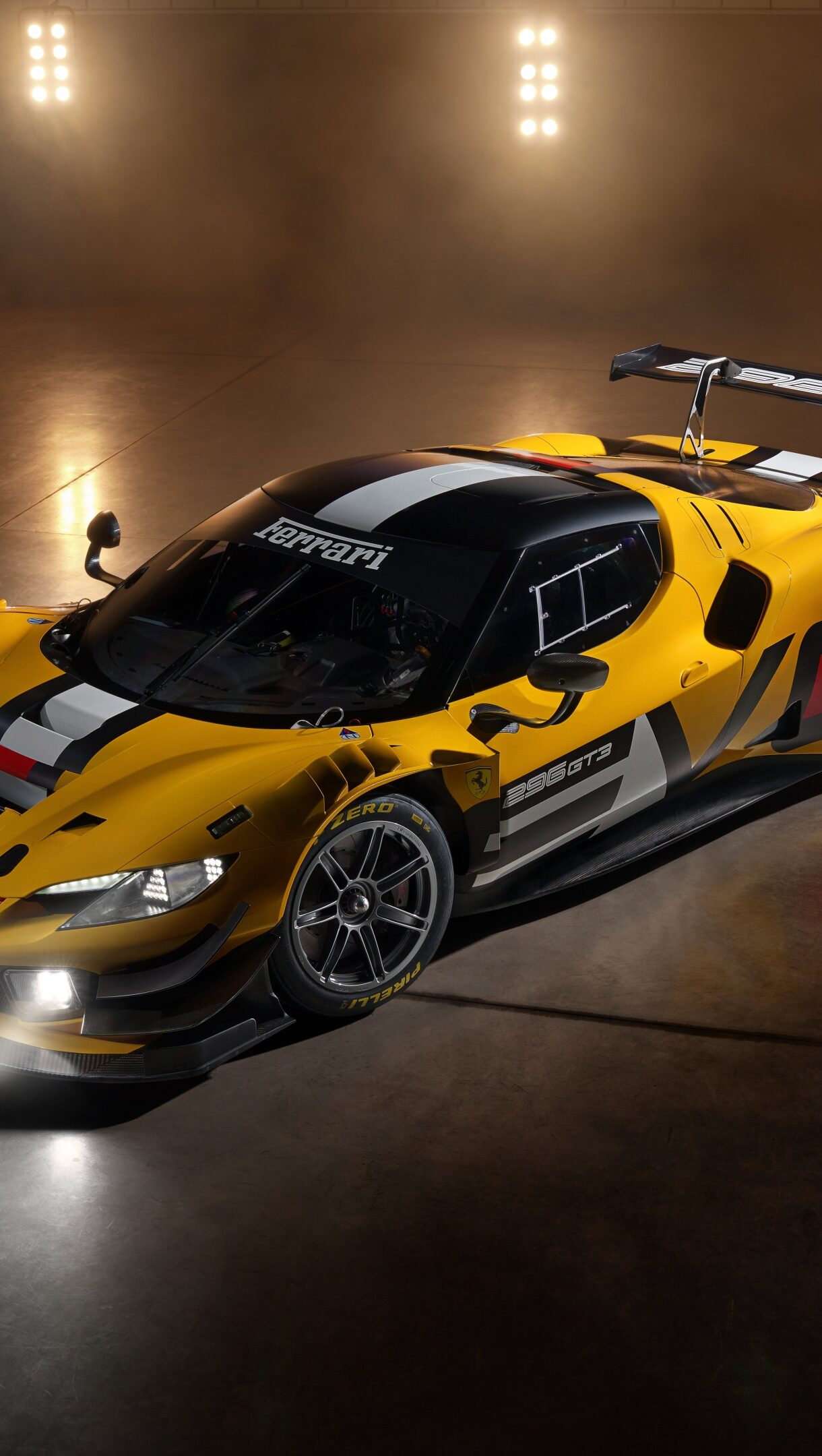 An electrifying 4K wallpaper presenting the vibrant red Ferrari 296 GT3 Evo 2026, poised on a polished dark surface within a sleek, minimalist environment. The powerful curves and sharp angles of the race car are brilliantly illuminated, highlighting its aggressive aerodynamic details and hinting at immense speed.