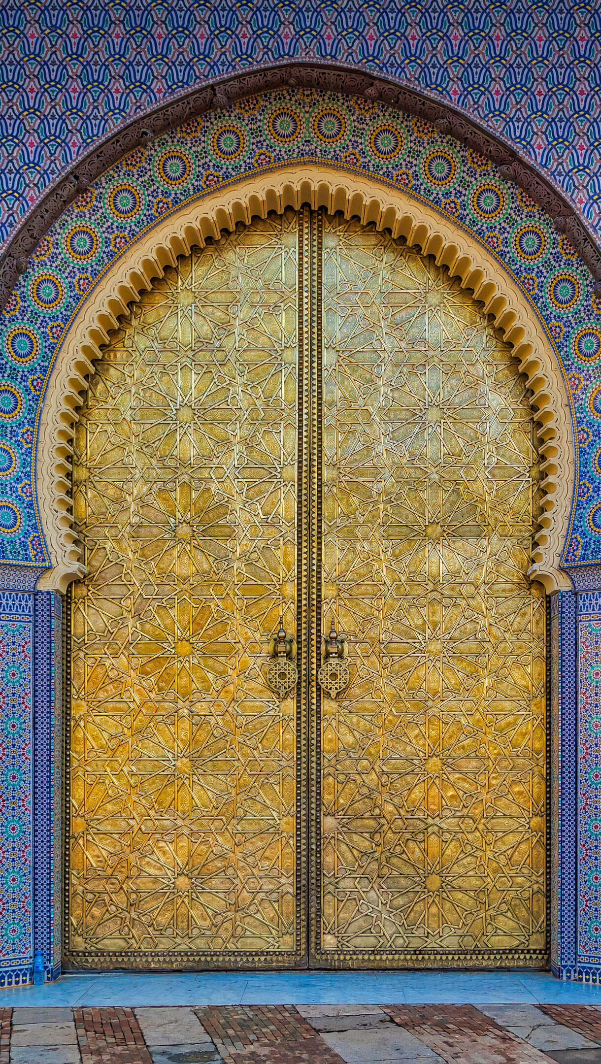 A breathtaking 4K wallpaper showcasing the iconic golden gates and intricate mosaic arches of the Royal Palace in Fez, Morocco. The dazzling gold of the ornate gates contrasts brilliantly with the vibrant blue and multicolored geometric patterns of the surrounding mosaic tiles, creating an atmosphere of regal splendor.