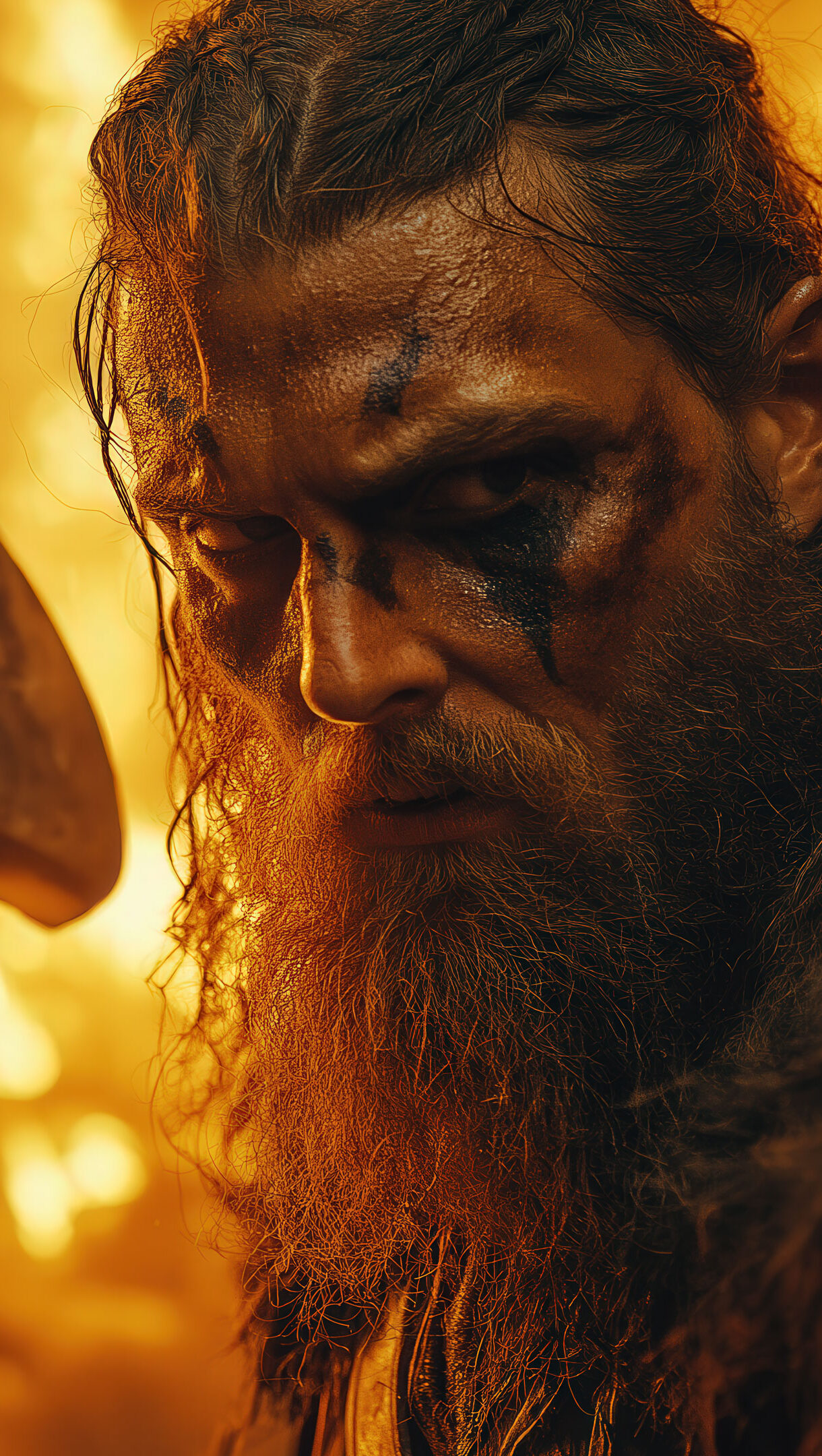 A stunning 4K wallpaper featuring a fierce Viking warrior engulfed in roaring flames. His battle-worn armor glows under the fiery blaze, while his intense gaze and raised weapon exude raw power and determination. Sparks and embers swirl around him, creating a dramatic and intense scene of Norse fury.