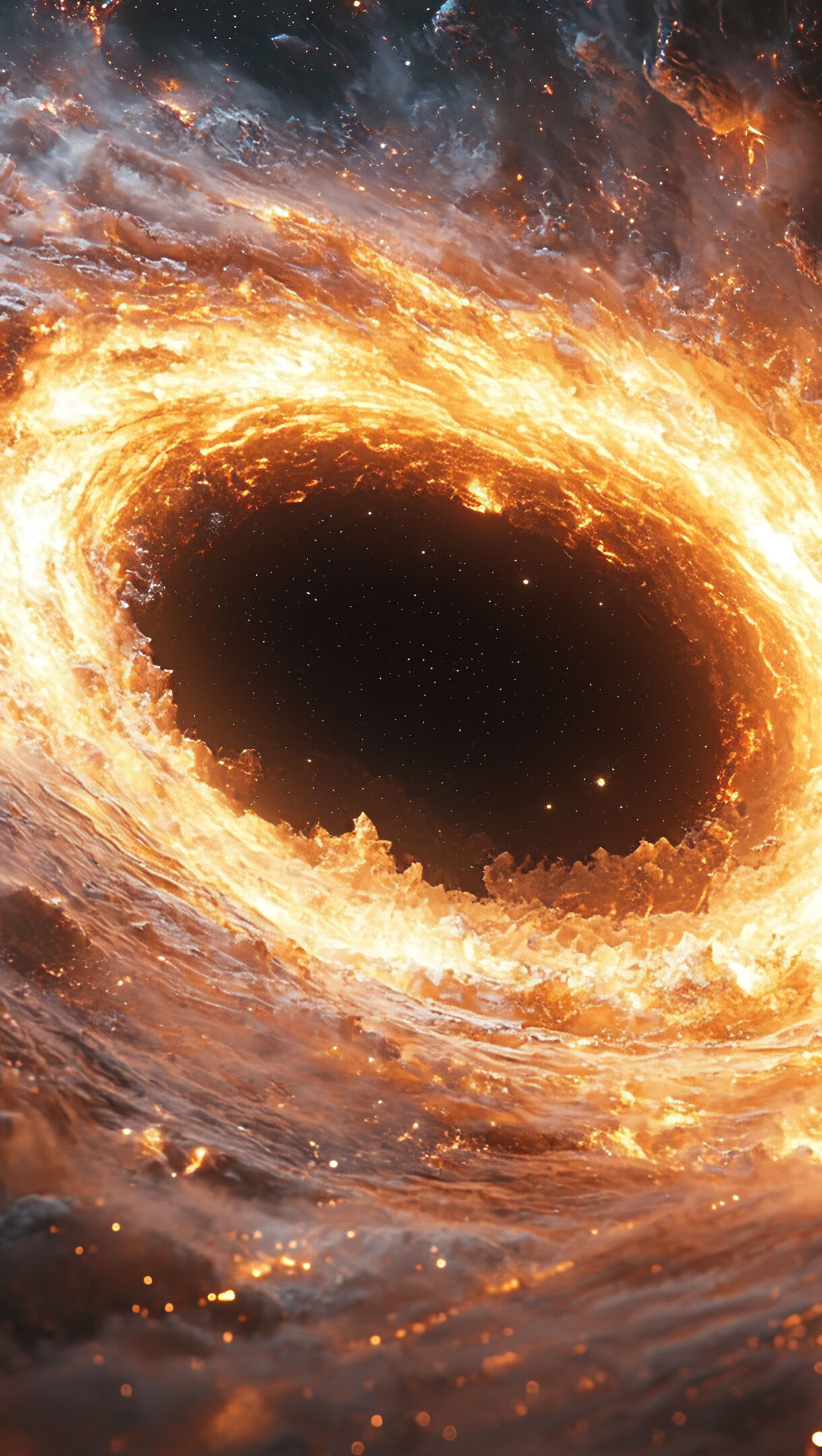 A mesmerizing 4K wallpaper featuring a fiery black hole at the heart of the cosmos. Swirling plasma and intense gravitational energy create a breathtaking vortex of glowing orange and red hues, making this AI-generated space artwork perfect for any desktop or mobile background.