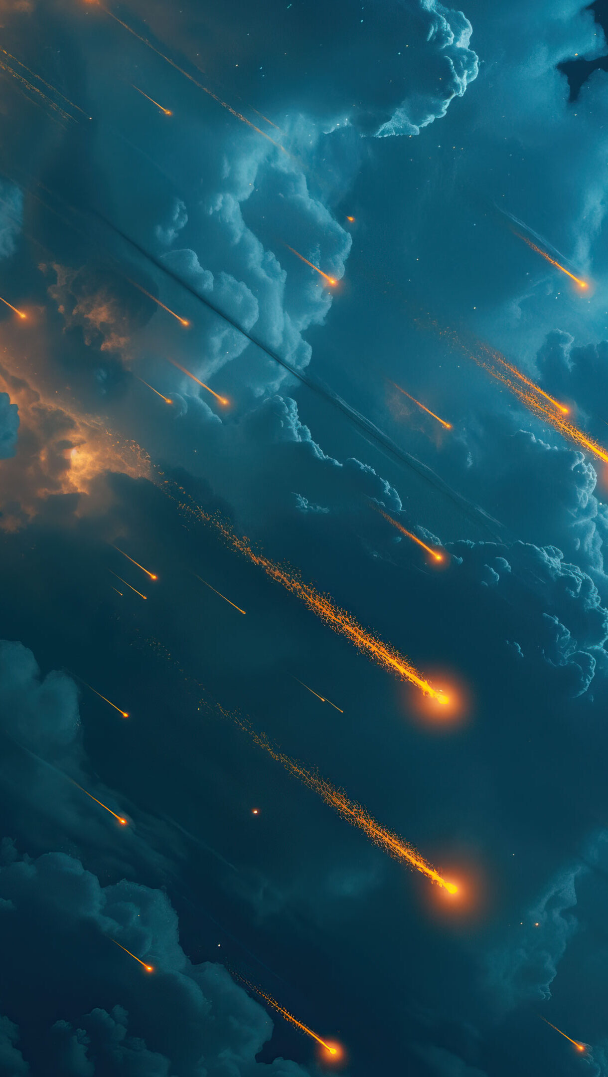 A stunning 4K wallpaper featuring a fiery meteor shower lighting up the night sky. This celestial display captures the intensity and beauty of meteors streaking across a star-studded backdrop, ideal for your desktop or mobile wallpaper.
