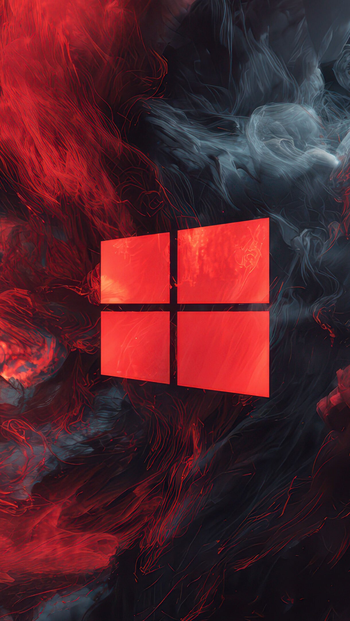 A fiery 4K wallpaper displaying a prominent, glowing red Windows logo centered amidst an abstract explosion of swirling red and dark gray smoke. The vibrant, almost molten red smoke dramatically contrasts with the deep, cool gray, creating an energetic and intense atmospheric mood, enhanced by its fine, filamentous texture.