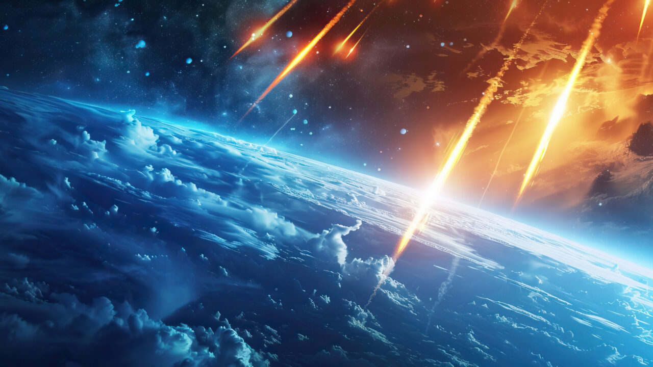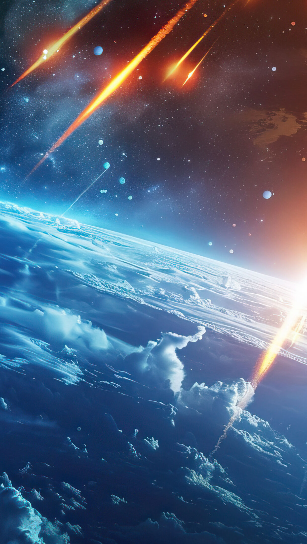A stunning 4K wallpaper featuring fiery space meteors descending against a dark cosmic background. The intense colors and dynamic movement of the meteors create a dramatic and visually captivating scene, perfect for enhancing your desktop or mobile screen.