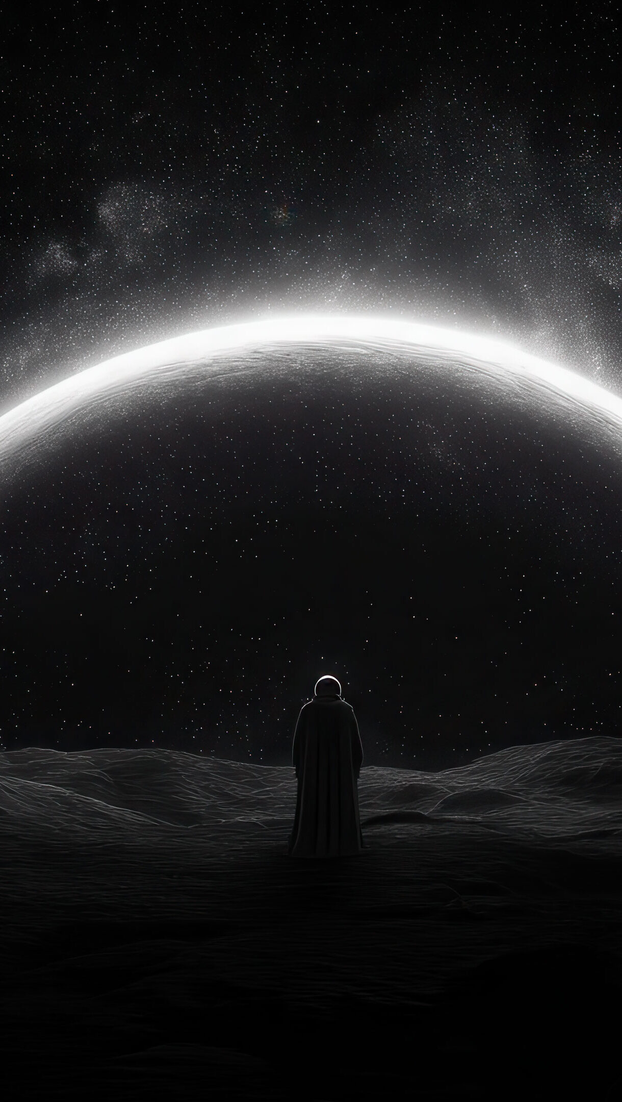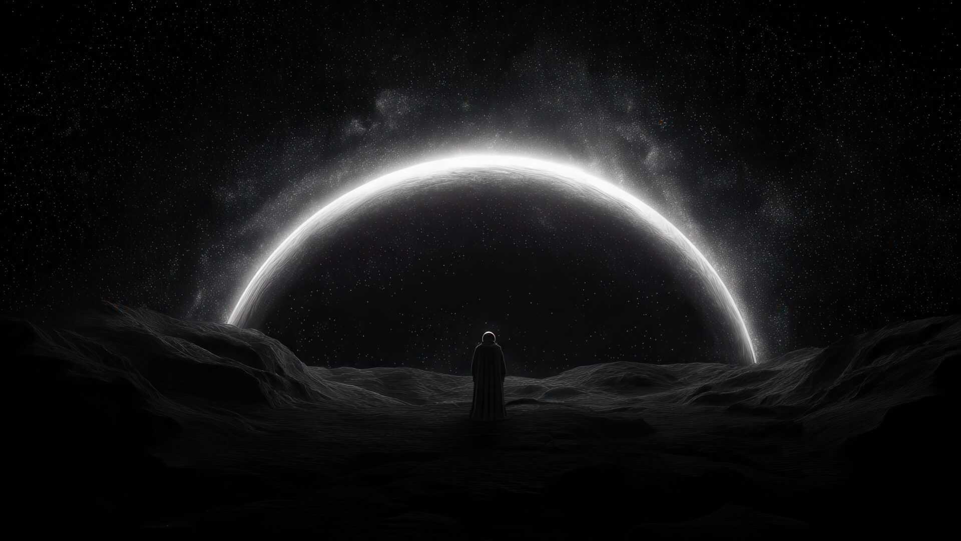 An epic 4K wallpaper capturing a robed figure standing on a dark, rugged planet surface. The figure gazes upon a massive, luminous arc dominating the star-filled black sky, creating a stark contrast that evokes a sense of immense scale and cosmic solitude.