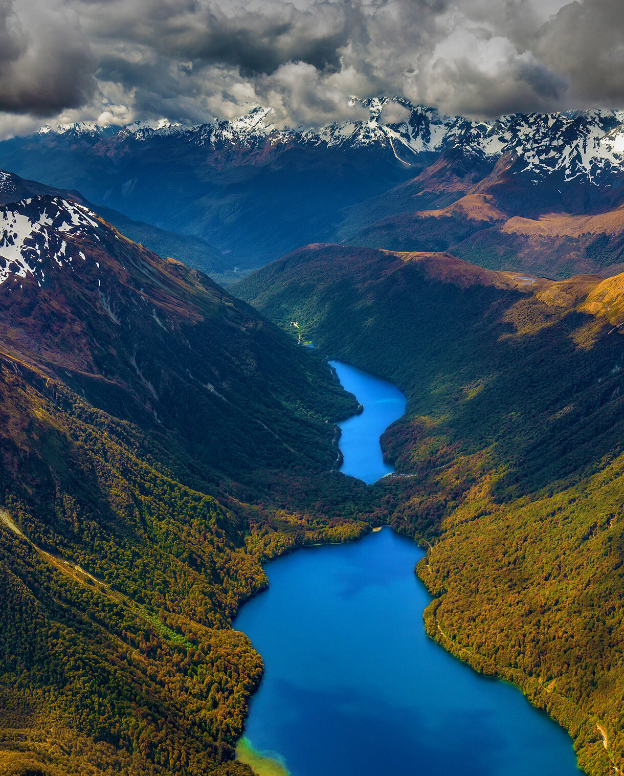 An epic 4K wallpaper capturing the majestic Fiordland National Park in New Zealand, showcasing a deep blue fjord winding through vast mountain landscapes. Dramatic storm clouds loom over snow-capped peaks, casting dynamic shadows and light across the vibrant golden-brown slopes and emphasizing the brilliant turquoise of the winding waterway below.
