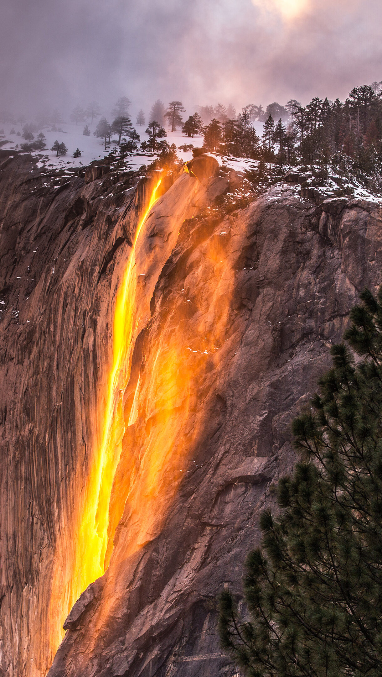 A breathtaking 4K wallpaper capturing the famous Firefall event at Horsetail Fall in Yosemite National Park, California, where the waterfall plunges down a massive granite formation. The ephemeral phenomenon illuminates the cascading water in brilliant fiery orange and yellow hues, creating a stunning visual of liquid light against the shadowed, snow-dusted cliffs and misty sky.