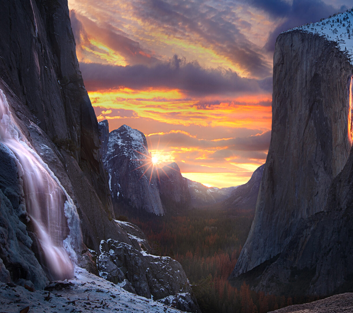 A breathtaking 4K wallpaper captures the iconic Firefall on Horsetail Fall in Yosemite National Park, set amidst towering cliffs and a vast valley at sunset. The striking Horsetail Fall glows with an ethereal orange Firefall effect, brilliantly illuminated by the sunset's golden light cascading through the dramatic valley.
