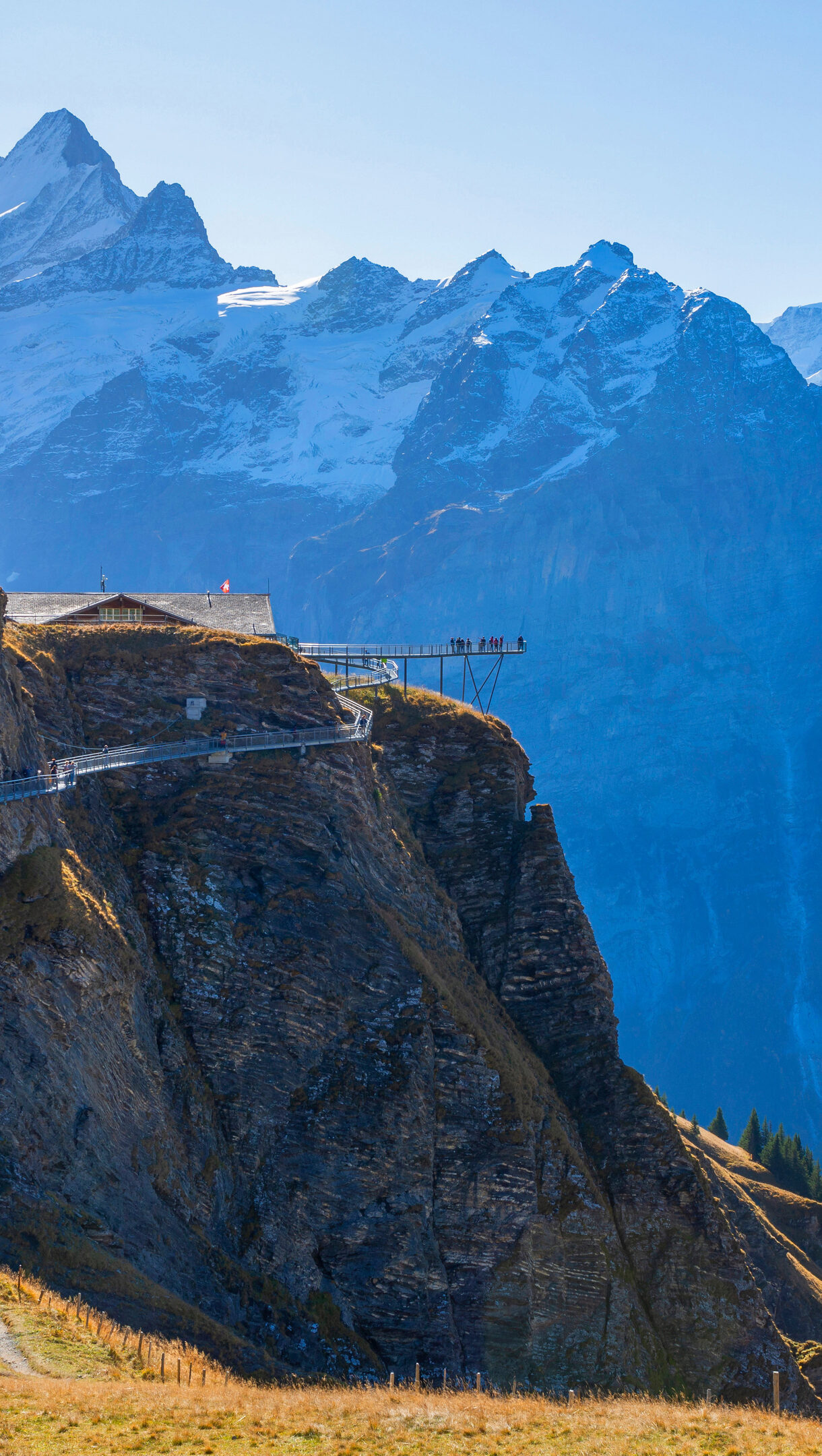 A breathtaking 4K wallpaper captures the First Cliff Walk in Grindelwald, Switzerland, winding along a rugged alpine mountainside. Sunlight dramatically illuminates the golden-brown cliff face and the modern metal walkway, offering spectacular panoramic views towards the distant, majestic snow-capped peaks under a brilliant blue sky.
