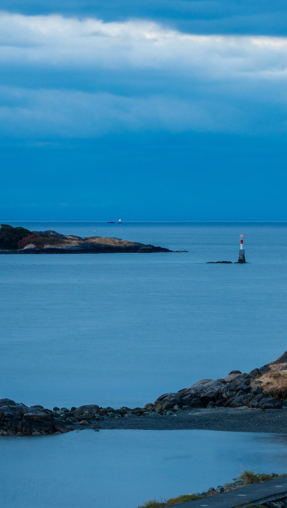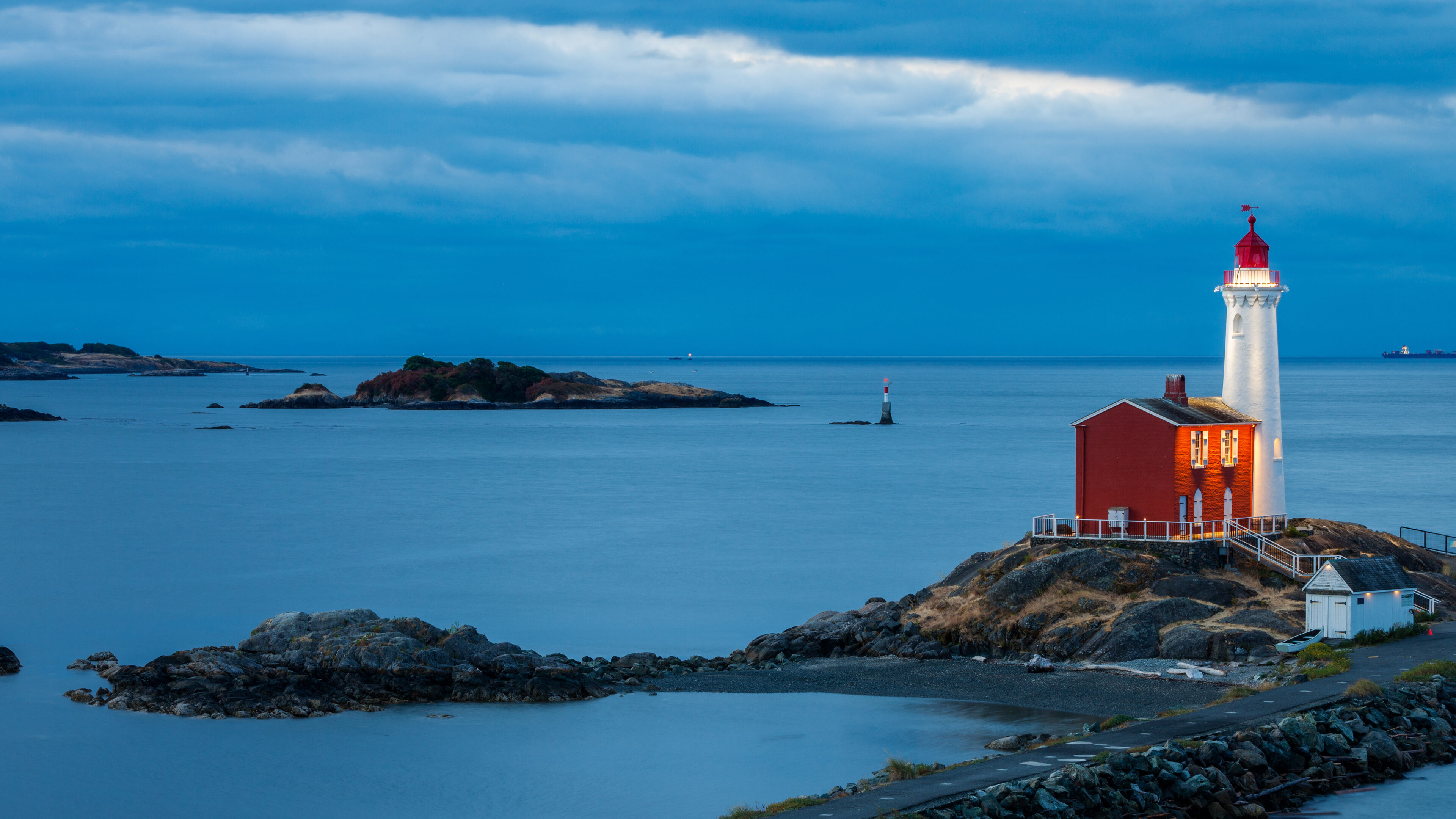 A serene 4K wallpaper capturing the Fisgard Lighthouse standing prominently in Esquimalt Harbor during the evening. Its brightly lit red dwelling and white tower contrast beautifully with the deep twilight blues of the calm harbor waters and overcast sky.