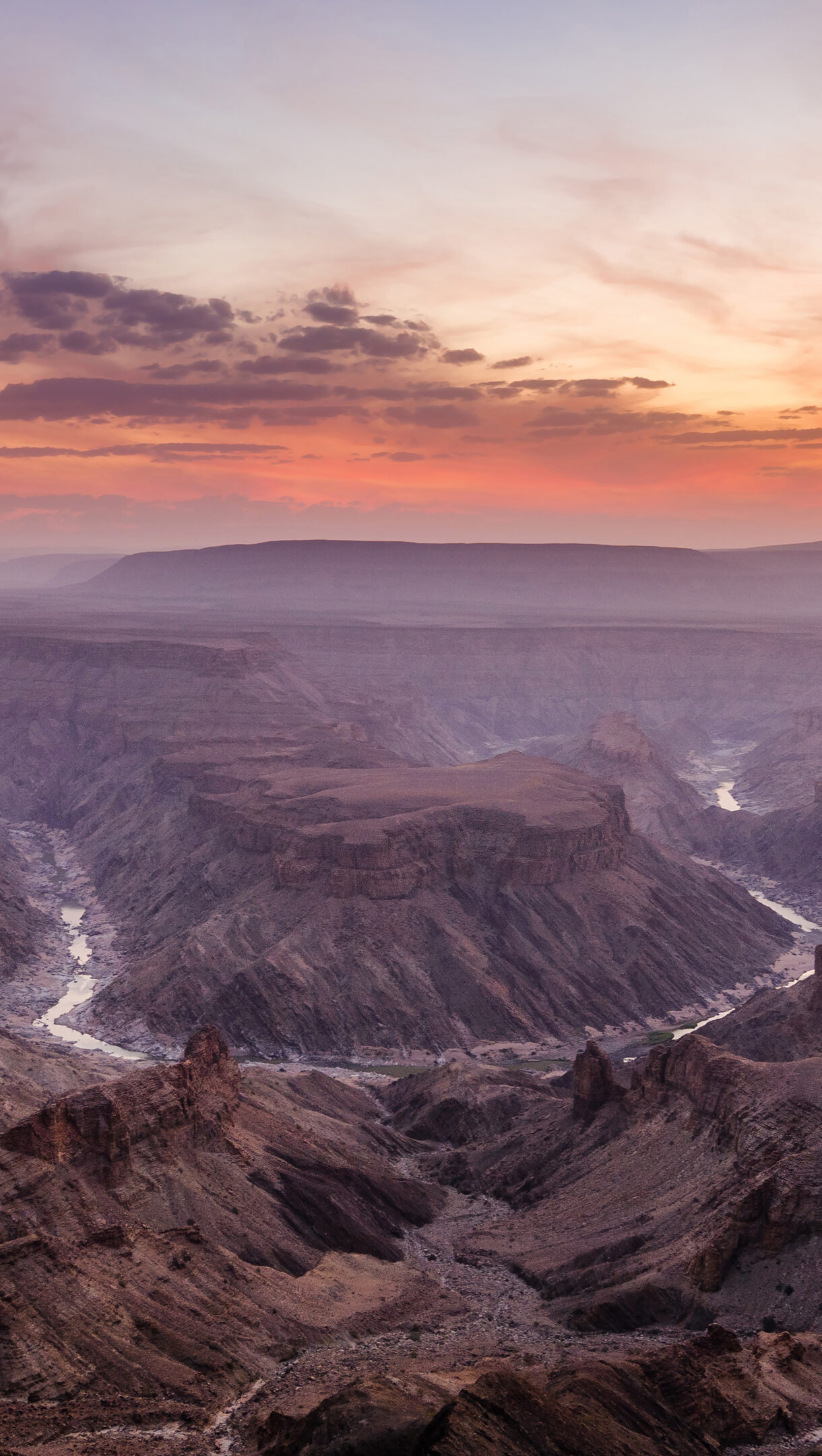 A captivating 4K wallpaper showcasing the vast, ancient Fish River Canyon in Namibia at sunset, with its deep gorge winding through the arid landscape. The dramatic interplay of vibrant orange, pink, and purple hues across the sky casts a breathtaking glow over the rugged, shadowed canyon walls and the shimmering river below.