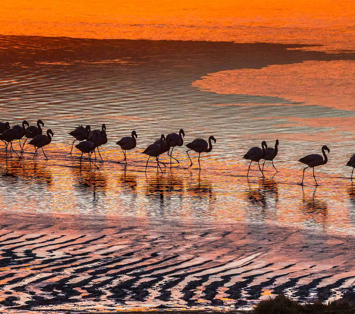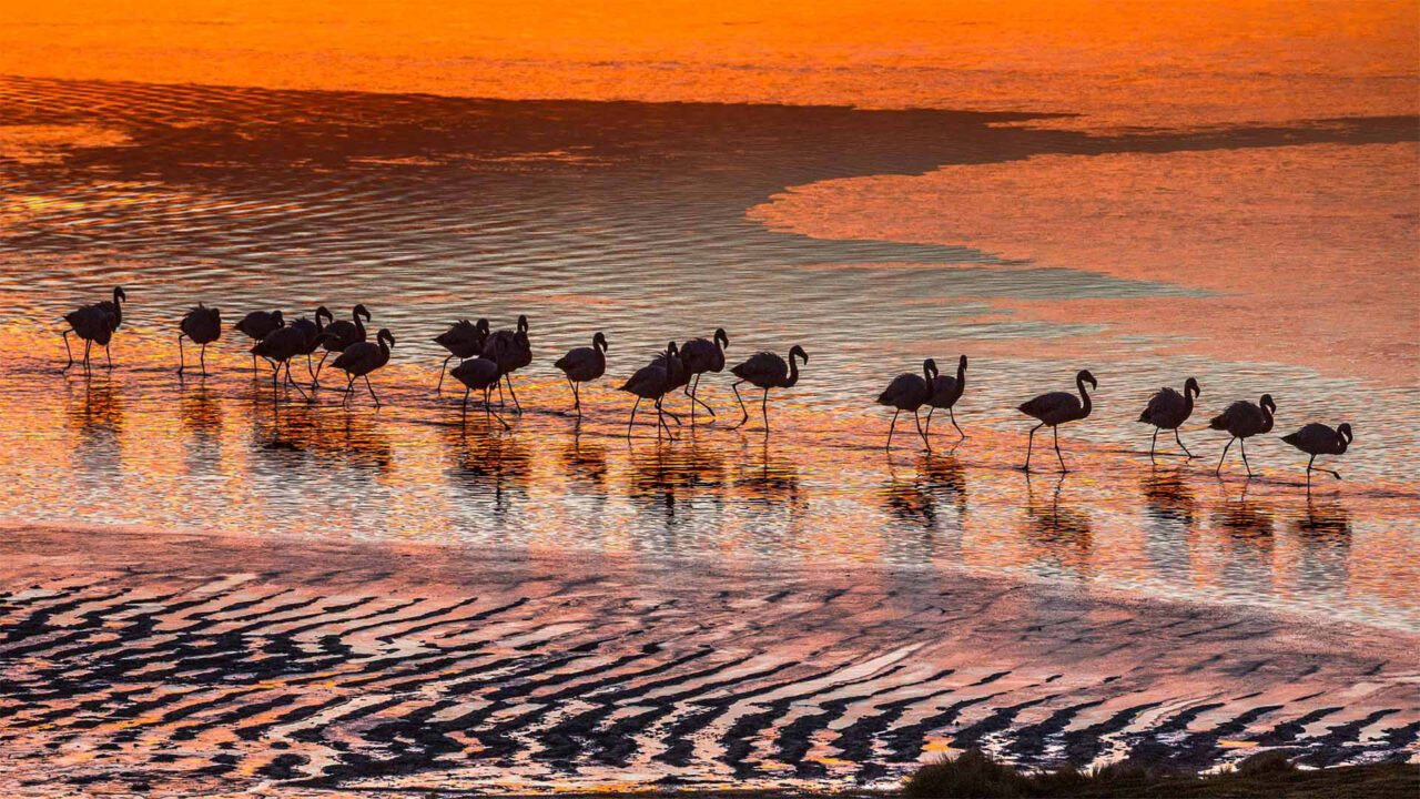 A breathtaking 4K wallpaper captures flamingos at sunset within the vast Eduardo Avaroa Andean Fauna National Reserve. Their dark silhouettes glide across the reflective, rippling waters, brilliantly illuminated by the intense, fiery orange and yellow sky.