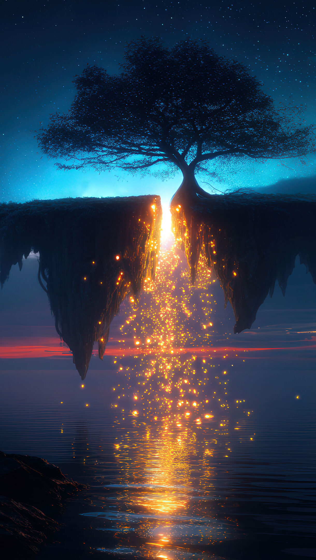 A surreal 4K wallpaper depicting a floating island with a lone tree under a starry night sky. The island hovers above the clouds, illuminated by a soft moonlight that casts gentle shadows on the tree and grassy surface, evoking a dreamlike, magical atmosphere.