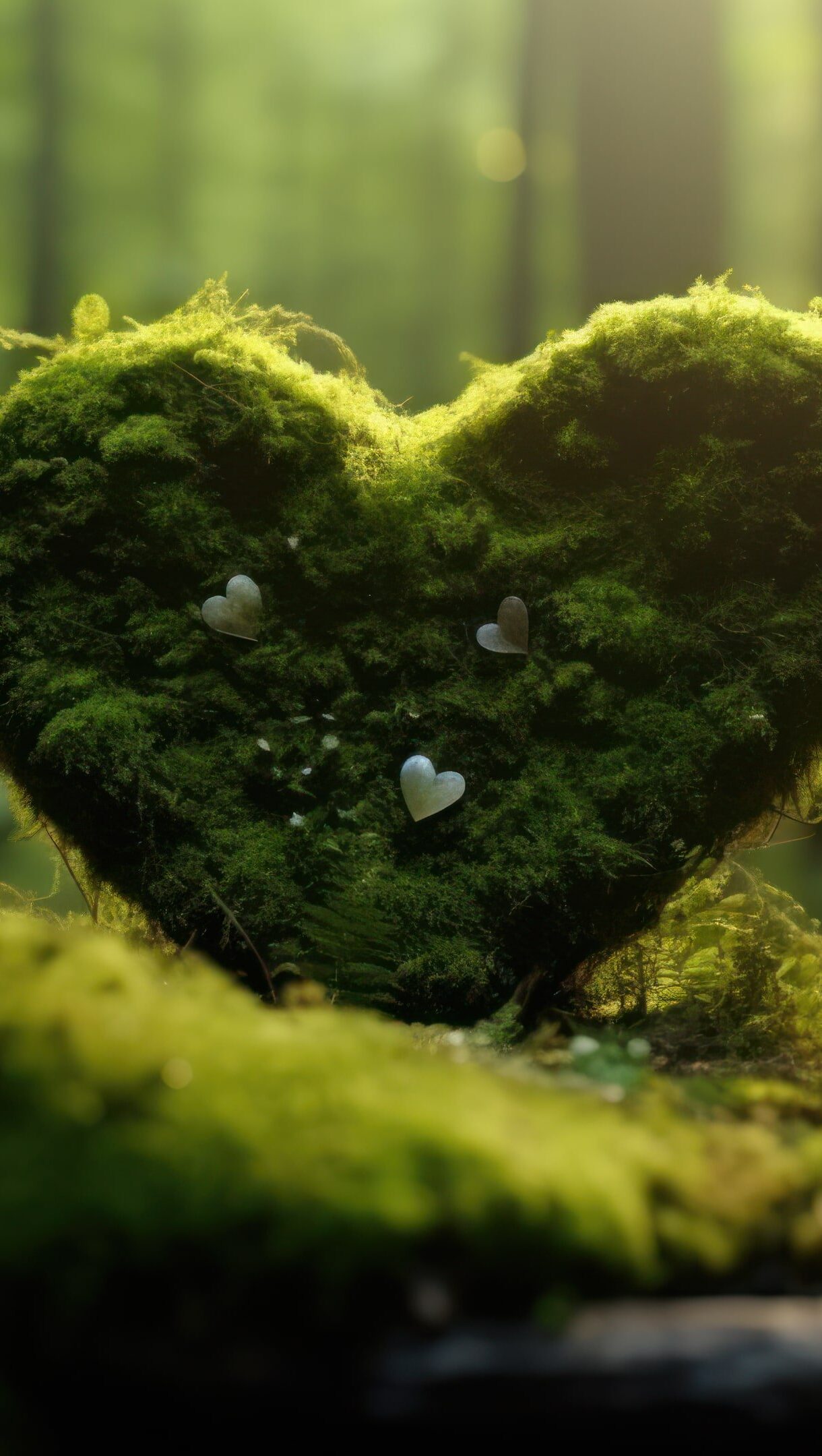A captivating 4K wallpaper displaying an AI-generated moss-covered heart surrounded by lush foliage, evoking a sense of flourishing nature and serenity. The intricate details and vibrant green hues create an enchanting visual centerpiece for your digital backdrop. Simply click the download button to bring this masterpiece to life on your screen as a desktop wallpaper or save it for later in your wallpaper collection.