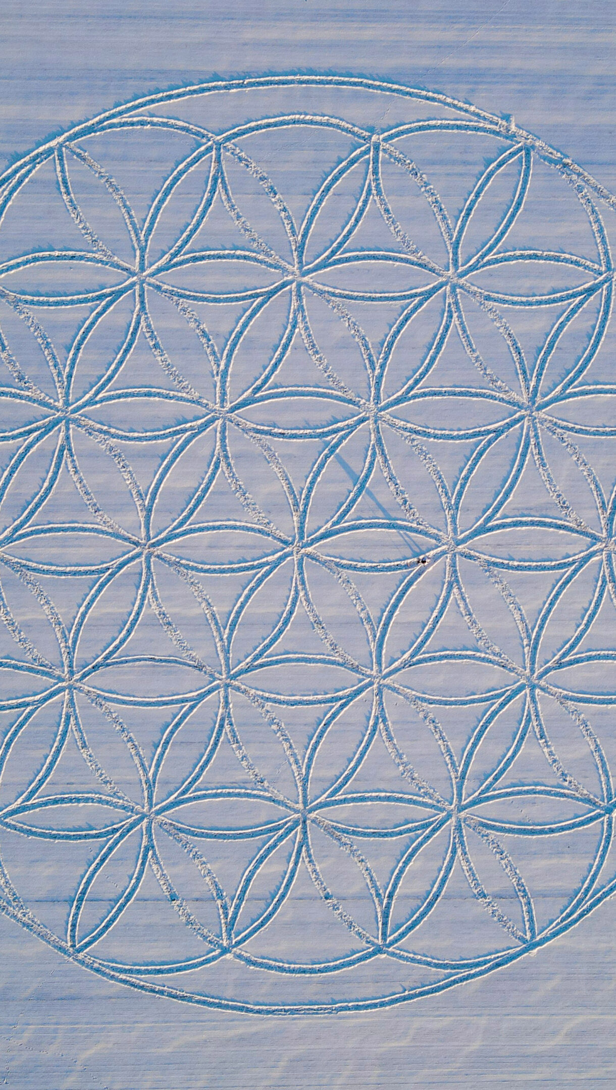 An exquisite 4K wallpaper of Michael Uy's 'Flower of Life' snow art, presented as a majestic aerial view across a pristine winter field. The vast geometric pattern is precisely etched into the snow, with a lone figure visible at its edge, creating a striking contrast of delicate artistry and expansive, tranquil scenery.