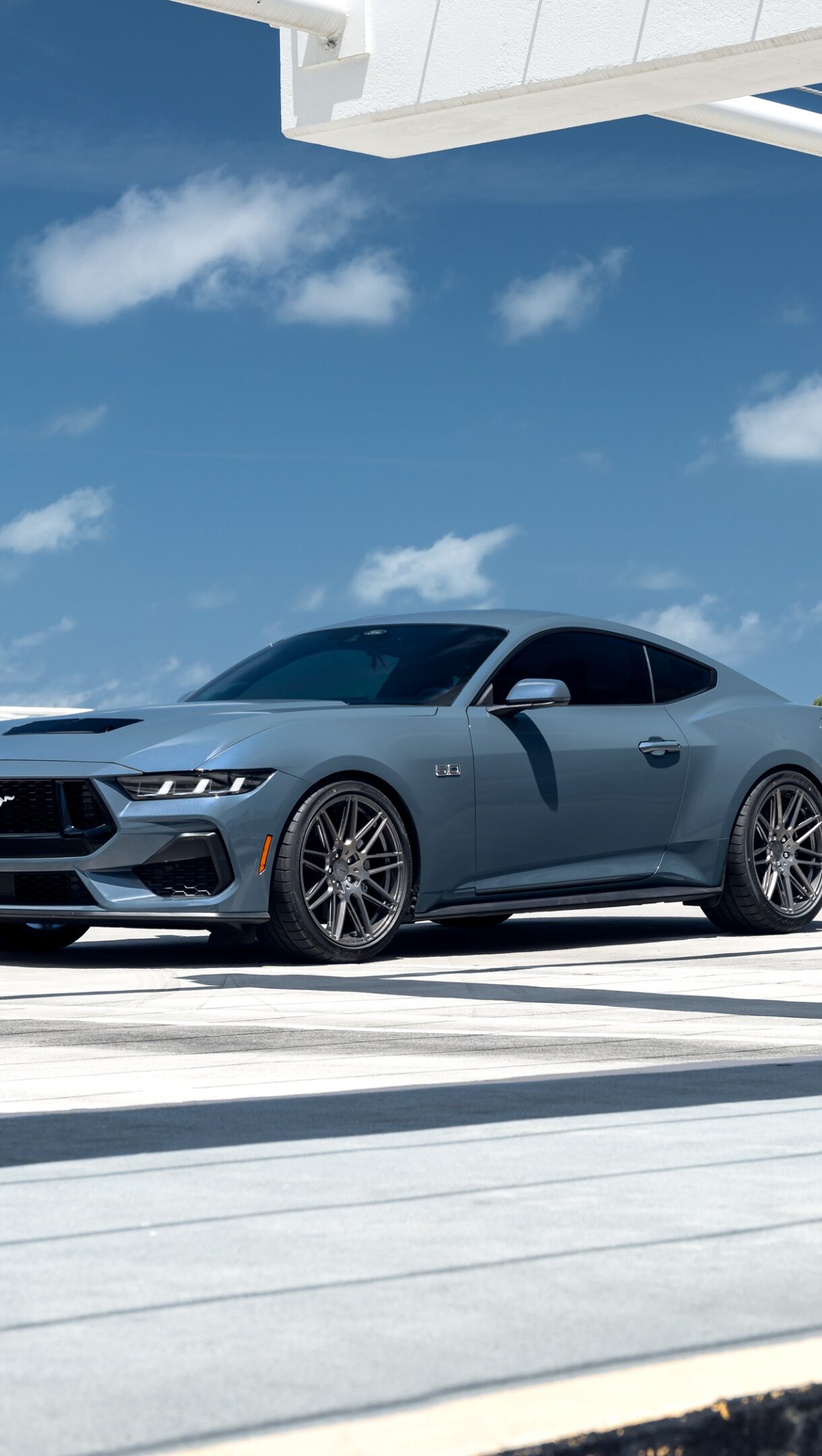 A stunning 4K wallpaper featuring a Ford Mustang GT outdoors, showcasing its sleek and powerful design. The high-resolution image captures the iconic sports car against a scenic backdrop, perfect for enhancing your desktop or mobile screen.