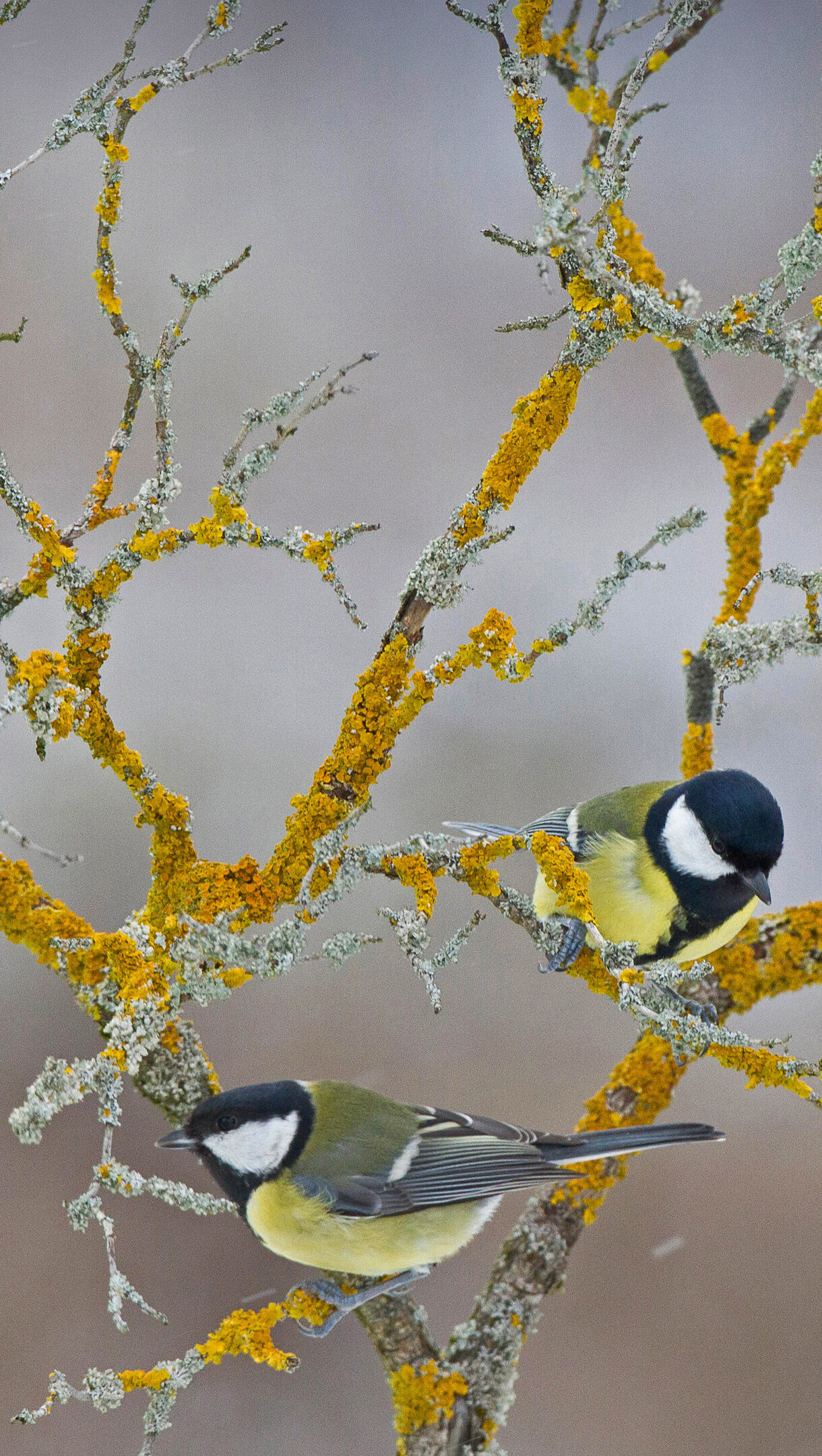 An enchanting 4K wallpaper presents four Great Tits perched on gnarled winter branches in France. Their vibrant yellow and black plumage creates a striking contrast against the branches thickly covered with brilliant yellow and pale green lichen, hinting at a lively ecosystem even in the cold.