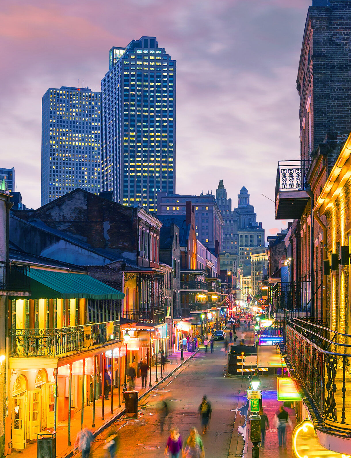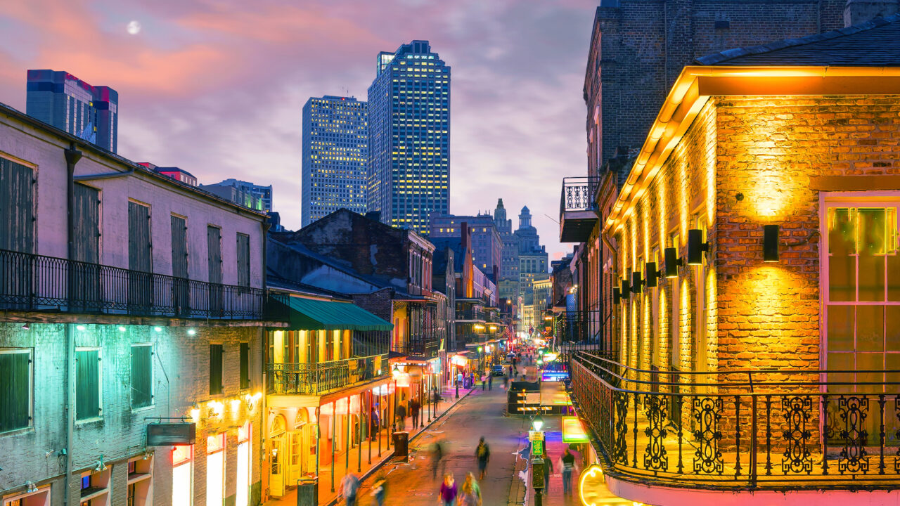 A vibrant 4K wallpaper showcasing an evening street scene in the French Quarter of New Orleans, featuring historic buildings with ironwork balconies and blurred pedestrians below. Warm, golden lights illuminate the brick facades and bustling street, creating a lively contrast with the soft, pastel-hued twilight sky and distant contemporary city towers.