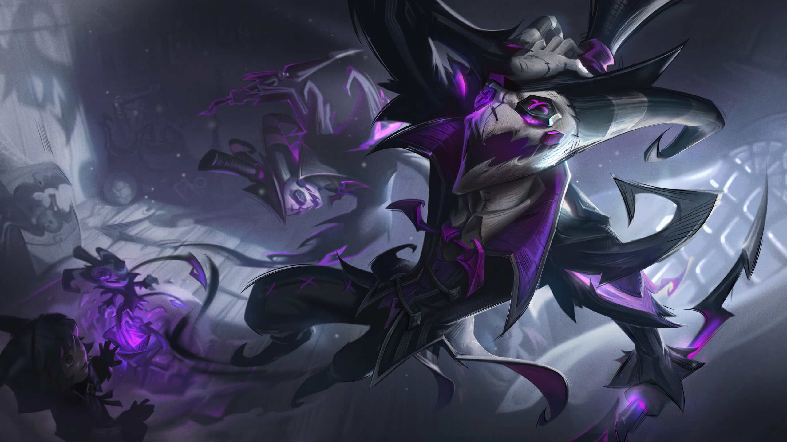 A haunting 4K wallpaper featuring the eerie Fright Night Shaco skin from League of Legends. Shaco, the twisted jester, is depicted in a nightmarish scene, donning his terrifying new skin with glowing eyes and sinister details, embodying a chilling sense of chaos and horror.