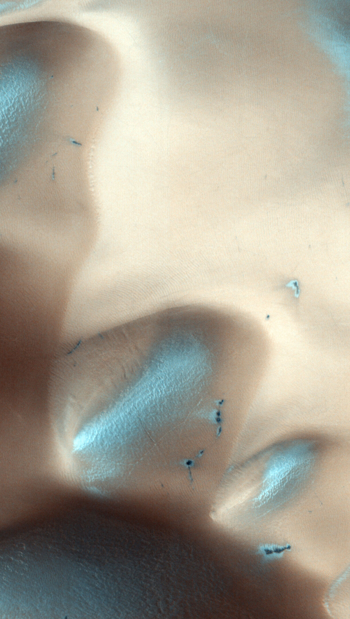 A breathtaking 4K wallpaper revealing frost-covered dunes across the Martian surface. Swirling formations of pale blue ice subtly coat the reddish sand, creating a stark, alien landscape bathed in soft, contrasting light.