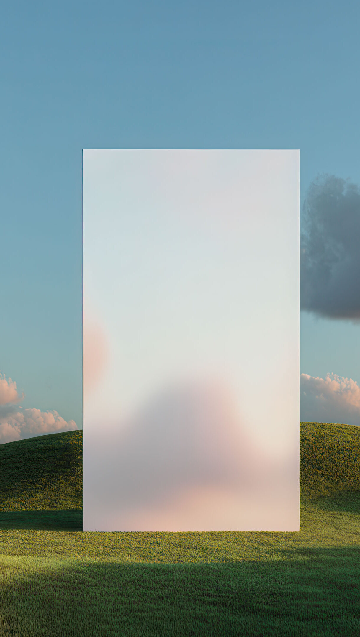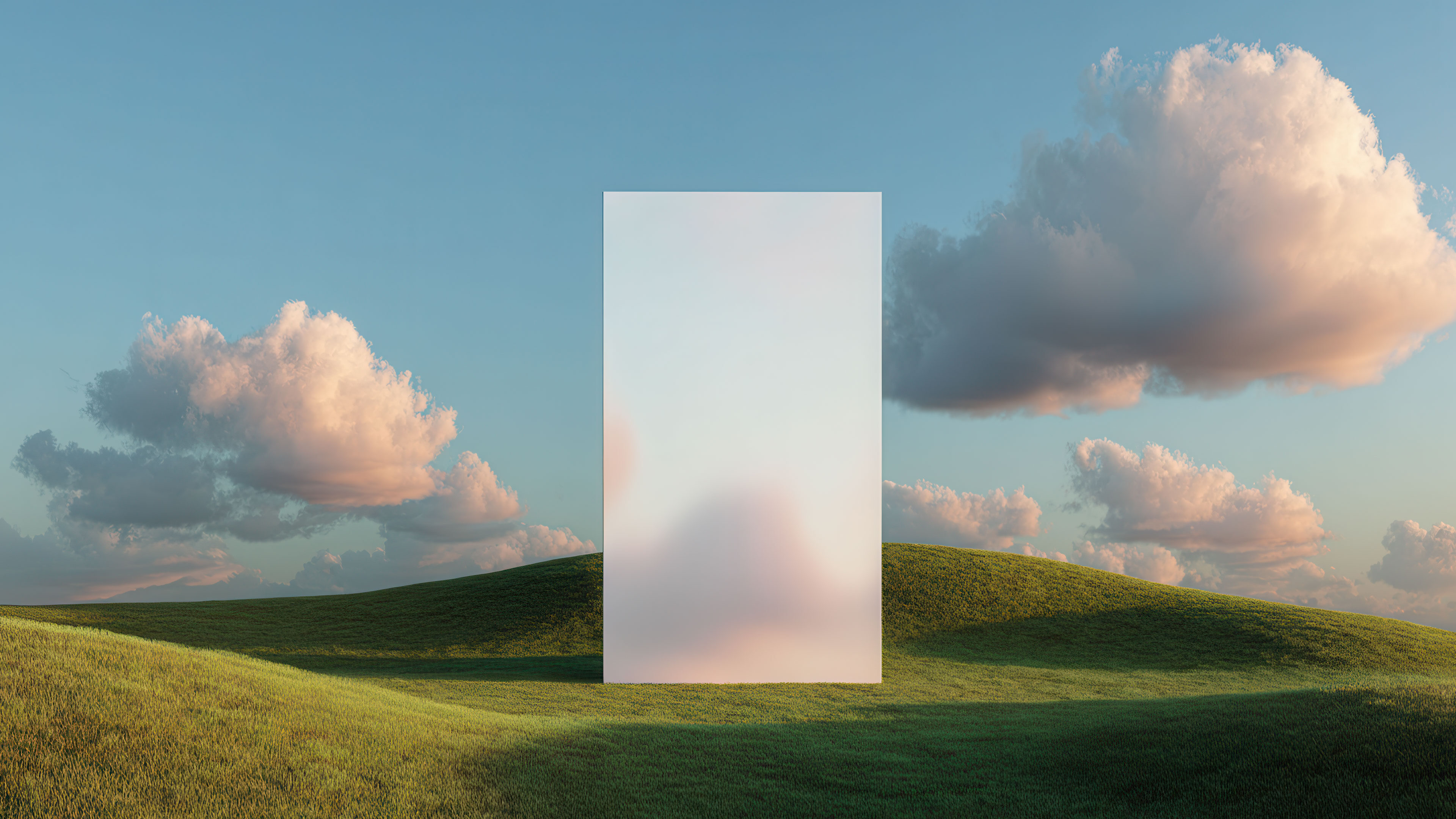 An ethereal 4K wallpaper presents a tall, frosted translucent panel centered within a dreamy, undulating green landscape under a soft blue sky. The panel subtly diffuses the background, blurring the distant peachy clouds and sunlit hilltops, which imbues the scene with a tranquil, contemplative mood.