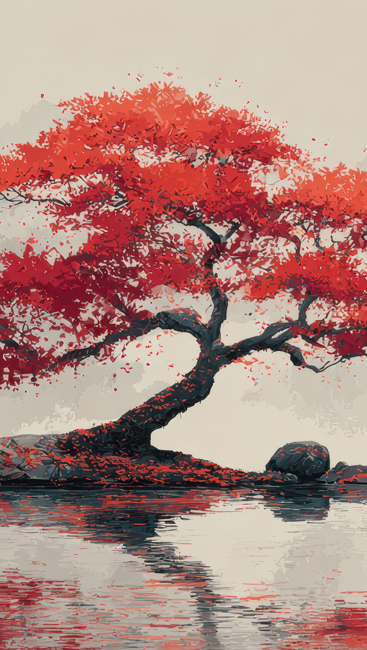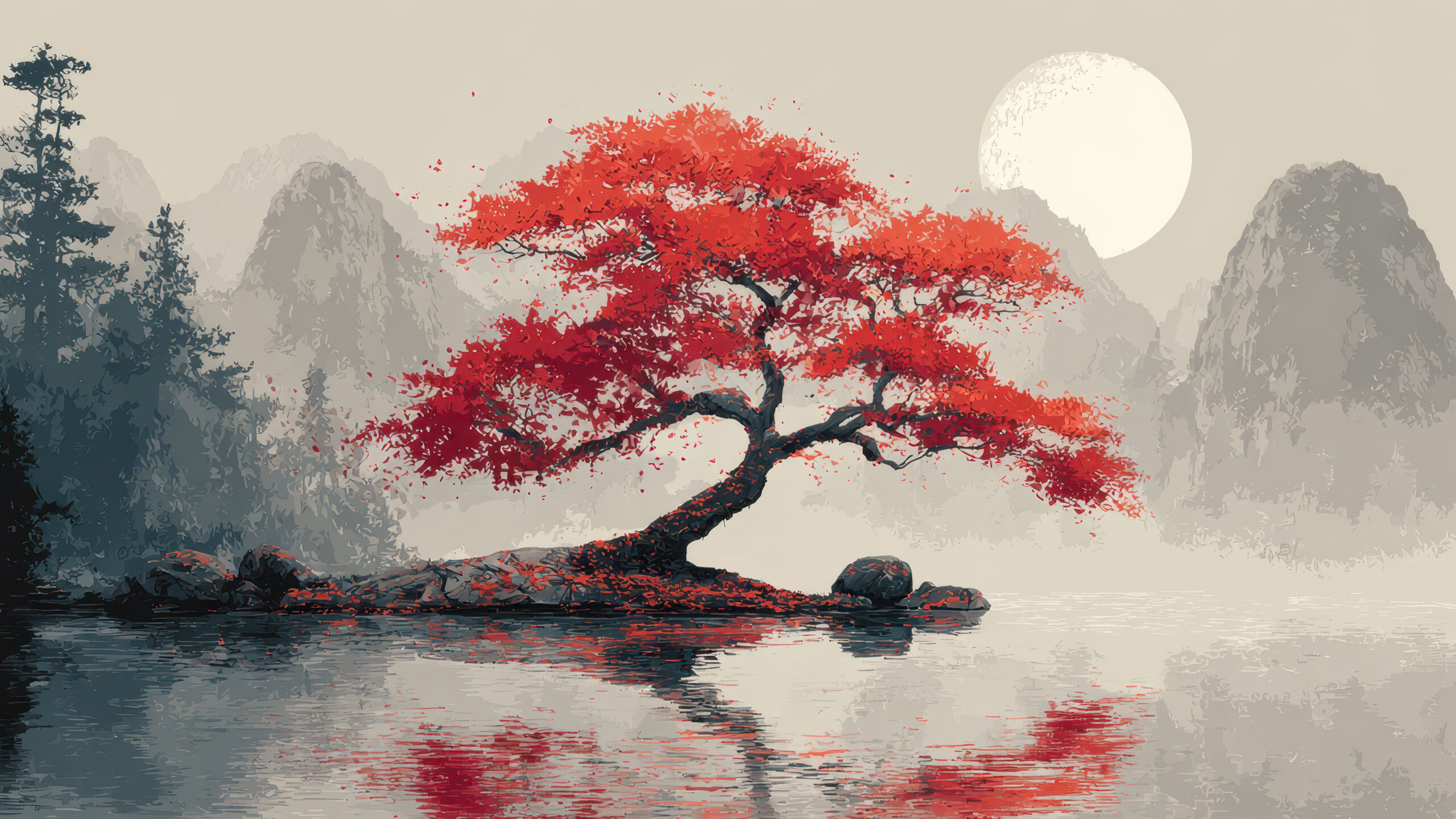 A magical 4K wallpaper showcases a vibrant red tree standing prominently on the edge of a serene lake, beneath a large full moon in a misty Japanese art landscape. The tree's fiery red foliage strikingly contrasts with the ethereal grey mist and the gentle glow of the full moon, creating a tranquil yet dramatic mood perfectly reflected on the still water.