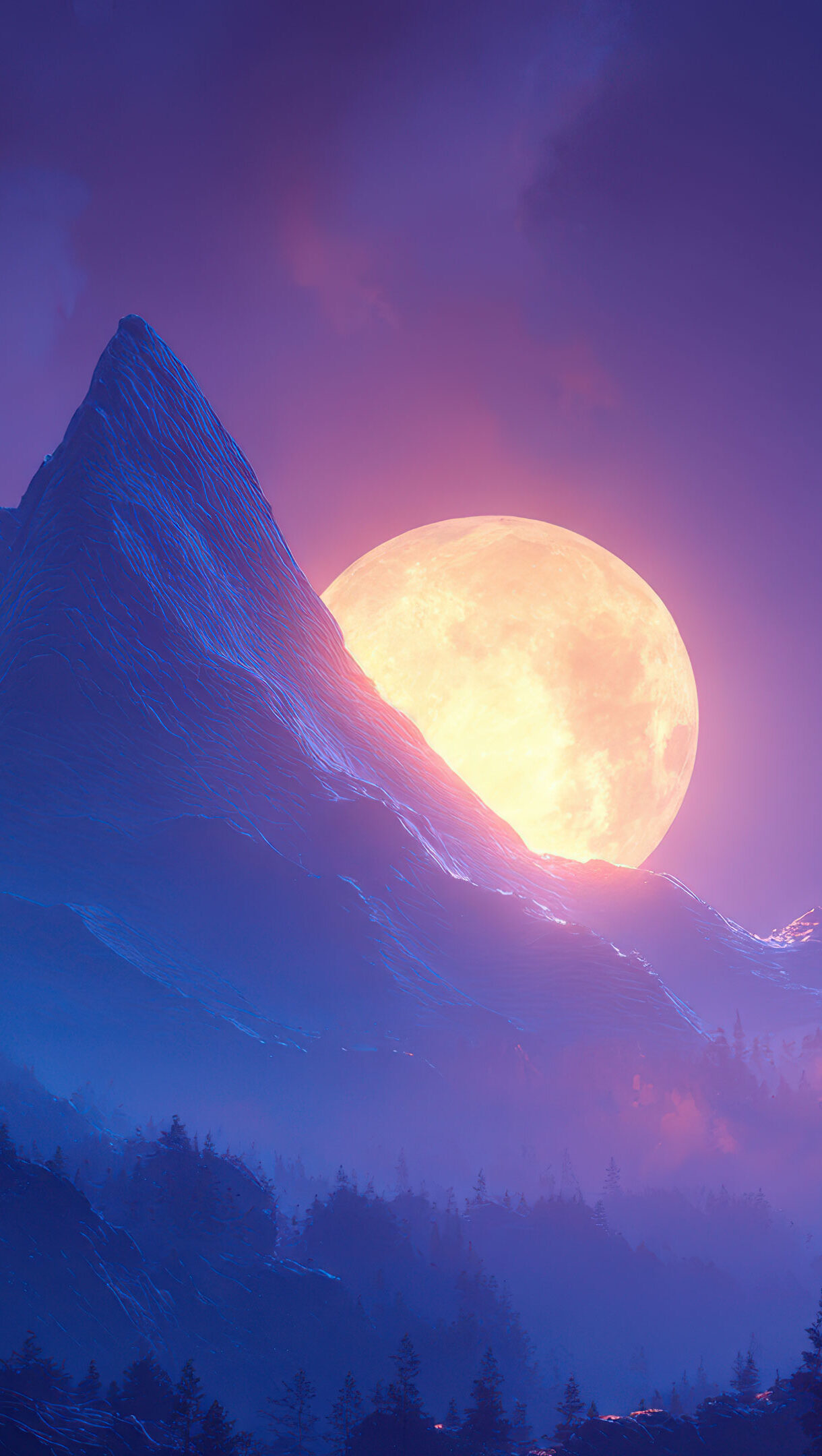 A breathtaking 4K wallpaper depicts a radiant full moon rising dramatically behind jagged mountain peaks in a mystical night landscape. The moon's warm, intense glow bathes the rugged terrain and surrounding fog in ethereal oranges and purples, creating a serene yet powerful scene.