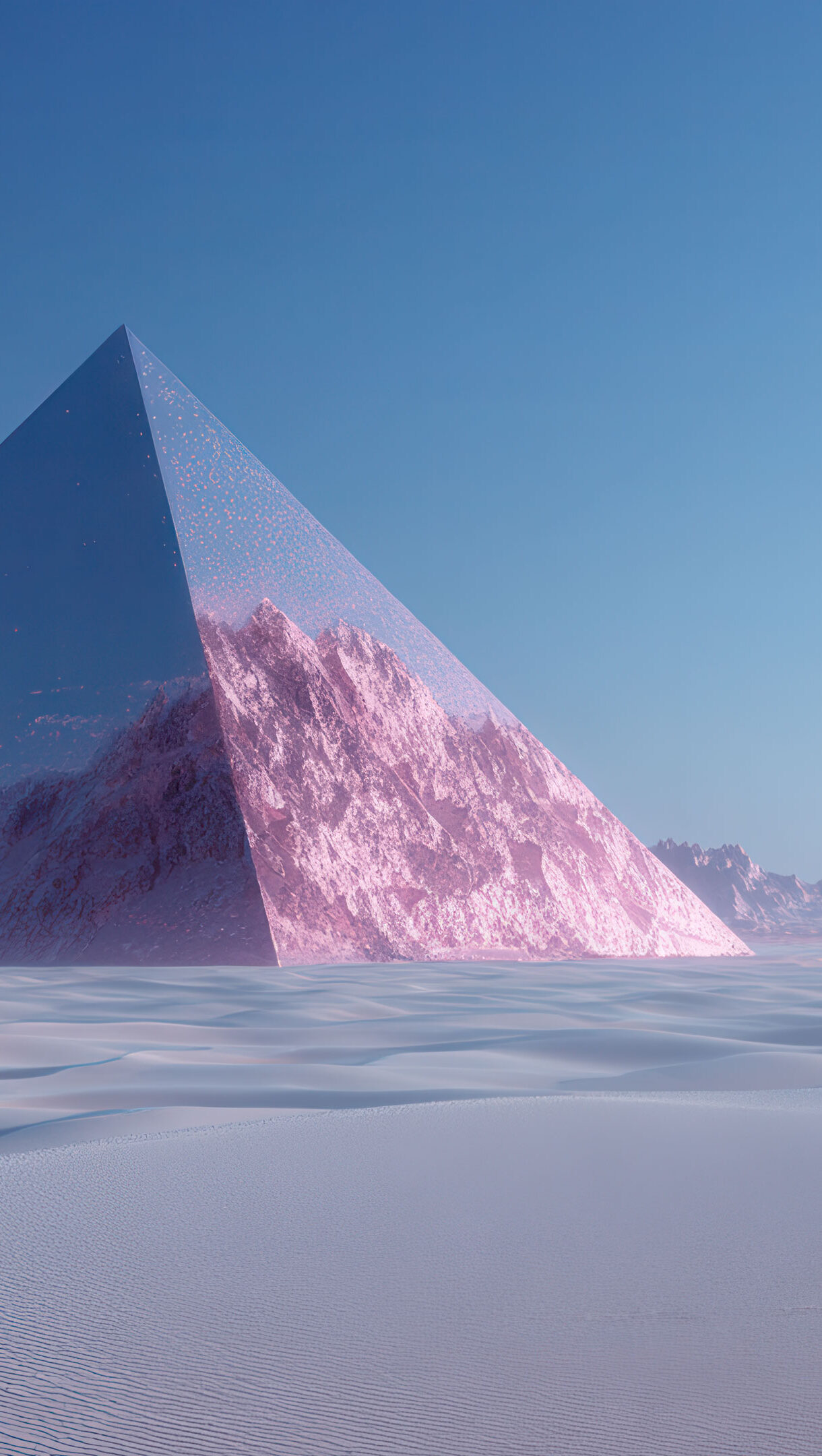 A futuristic 4K wallpaper featuring a massive, crystalline pyramid standing in a vast, rippling desert of soft pink and purple hues under a clear blue sky. Its translucent surfaces reveal jagged pink mountains within, creating an otherworldly contrast against the tranquil, rippled sand dunes stretching to distant lavender peaks.