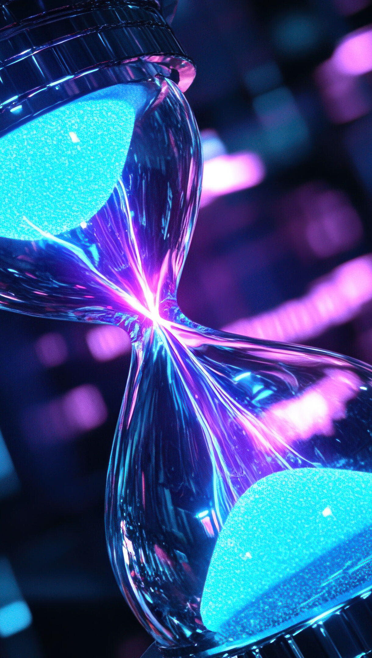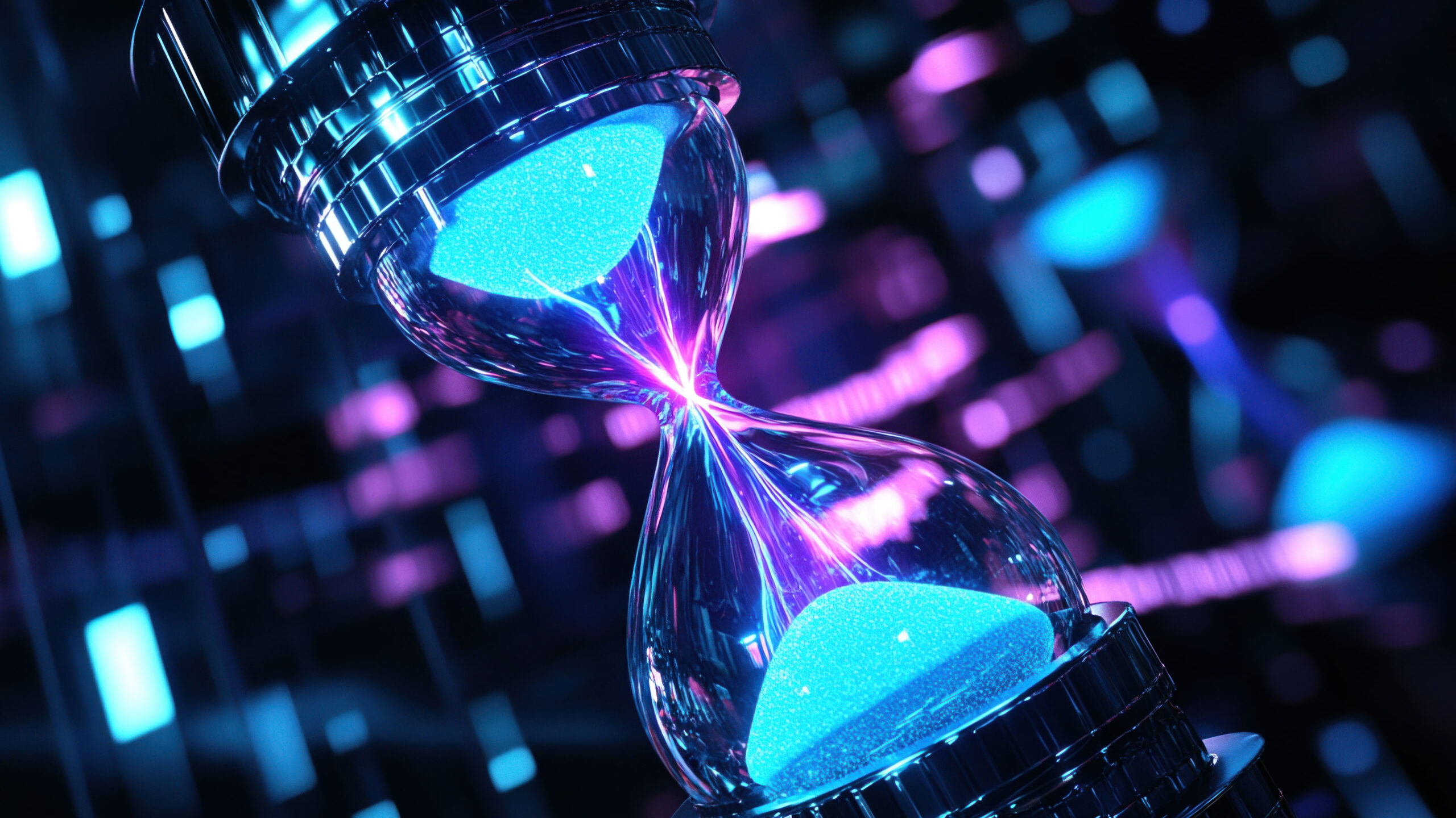 A stunning 4K wallpaper featuring a futuristic hourglass, with sleek, modern design elements and glowing sands. The surreal, sci-fi aesthetic of this time concept creates a captivating scene, blending the idea of time with technology and innovation in a visually striking way. Simply click the download button to bring this masterpiece to life on your screen as a desktop wallpaper or save it for later in your picture collection.