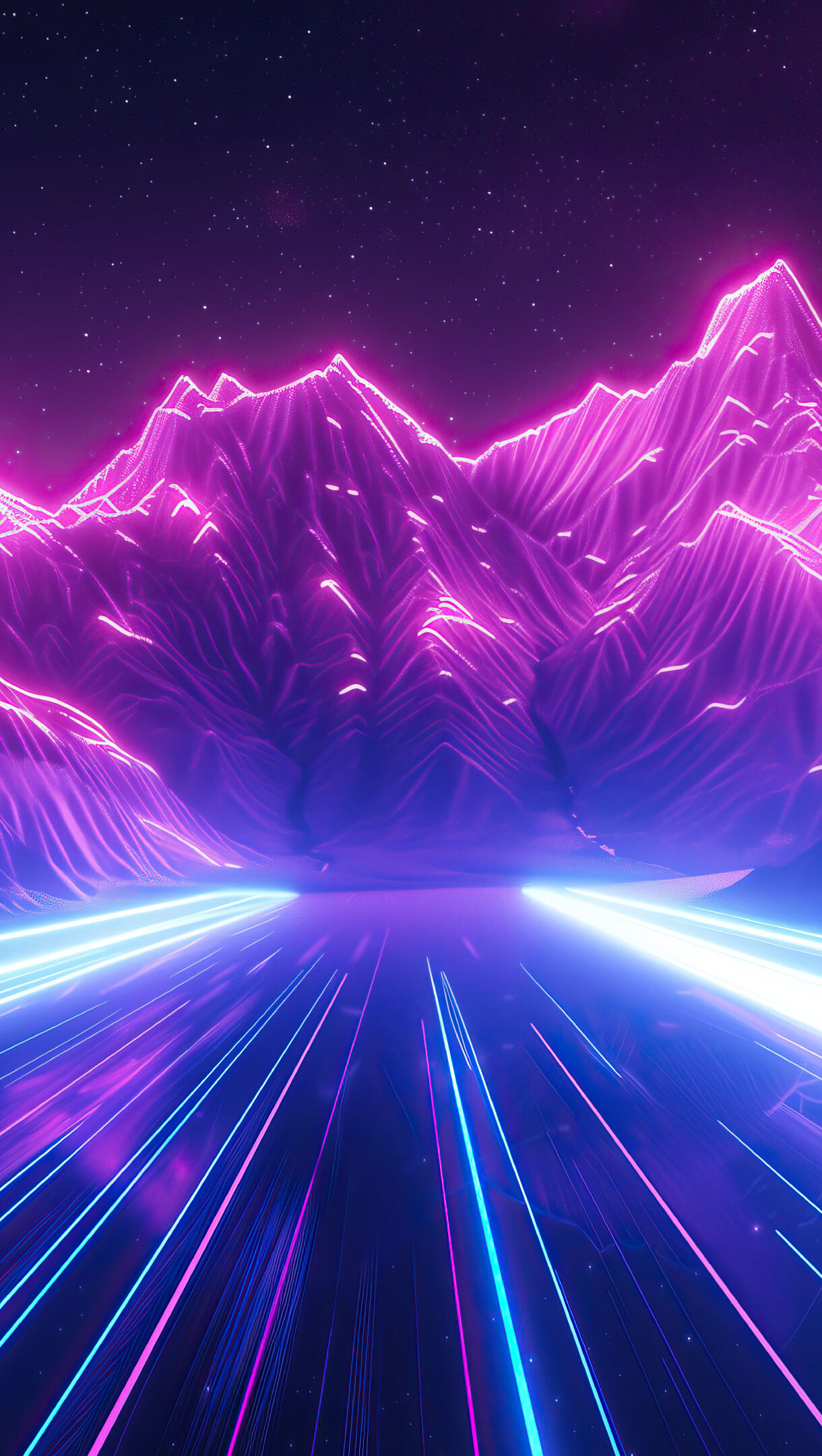 A stunning 4K wallpaper featuring futuristic neon mountains and dynamic light trails against a dark backdrop. This digital artwork captures a vibrant, sci-fi landscape that creates a mesmerizing visual experience, perfect for your desktop or mobile wallpaper.