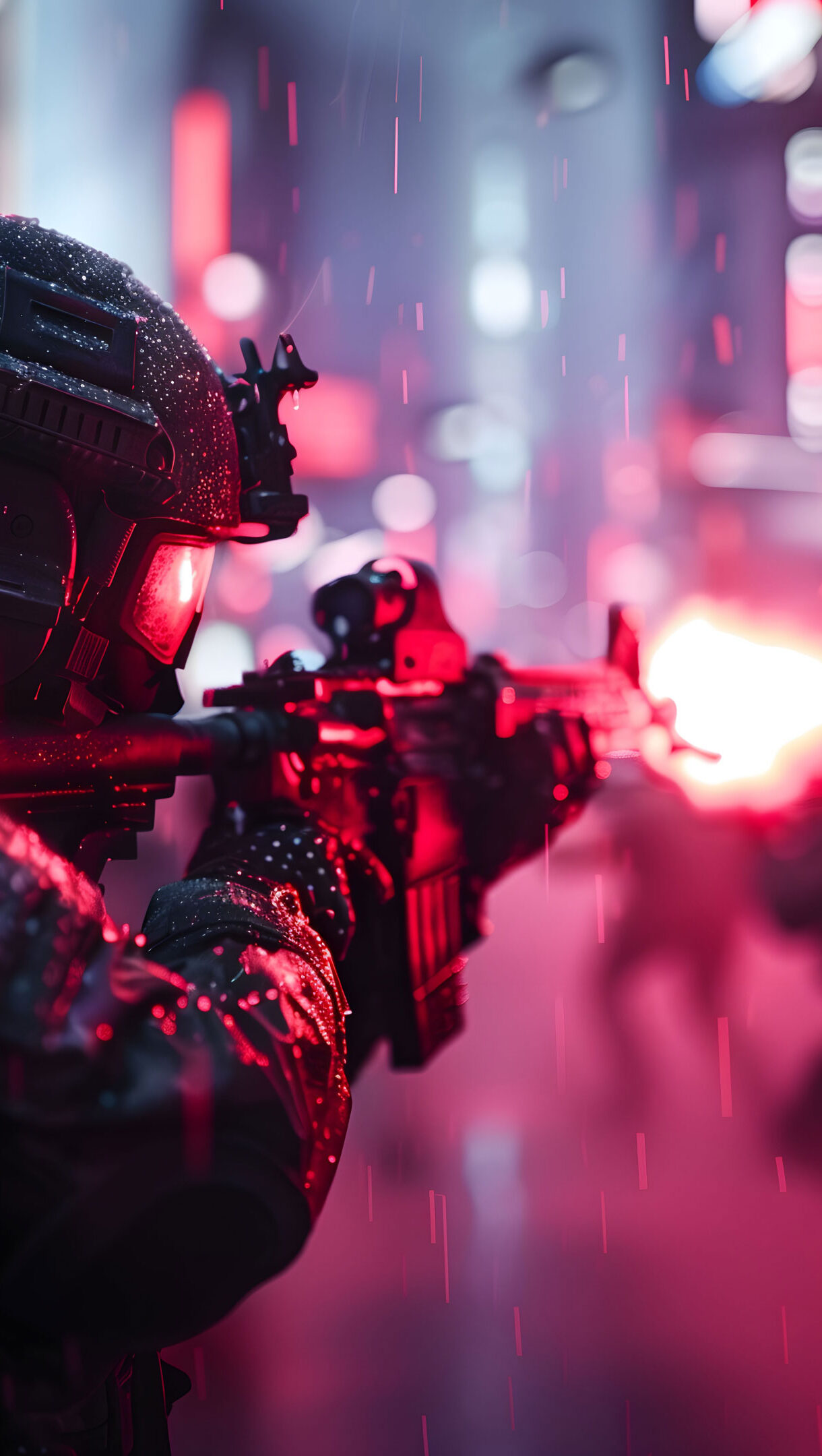 A striking 4K wallpaper featuring futuristic soldiers standing amidst a vibrant neon rain. The sci-fi scene is brought to life with a blend of neon colors and digital effects, creating an atmospheric and dystopian backdrop perfect for enhancing your desktop or mobile screen.