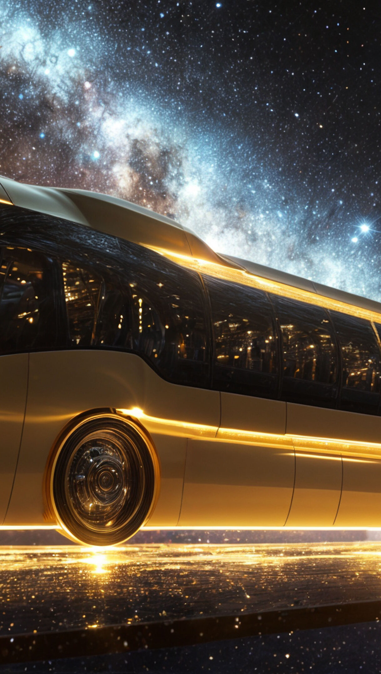 A mesmerizing 4K wallpaper featuring a futuristic space bus traveling through the cosmos, surrounded by distant stars and a vibrant galaxy backdrop. This stunning AI-generated artwork brings space travel to life with intricate details and a high-tech design, perfect for your desktop or mobile screen.