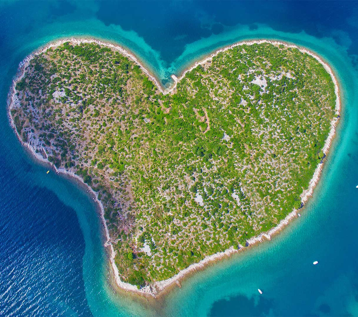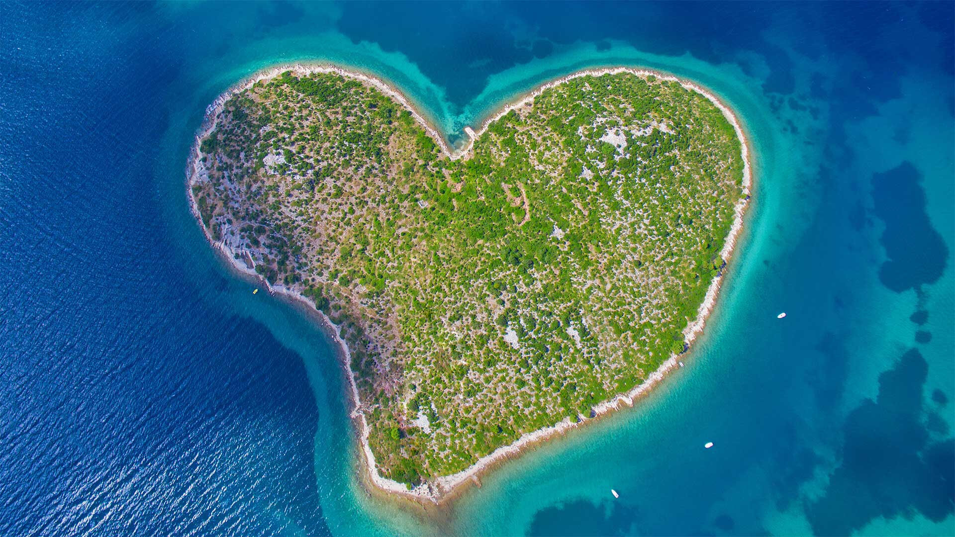 A captivating 4K wallpaper showcases Galešnjak Island, an iconic heart-shaped landmass, floating majestically in the clear azure waters of the Adriatic Coast. The island's verdant, scrub-covered terrain is sharply outlined by bright turquoise shallows that gradually deepen into the breathtaking sapphire blue of the surrounding sea, emphasizing its unique and romantic form.