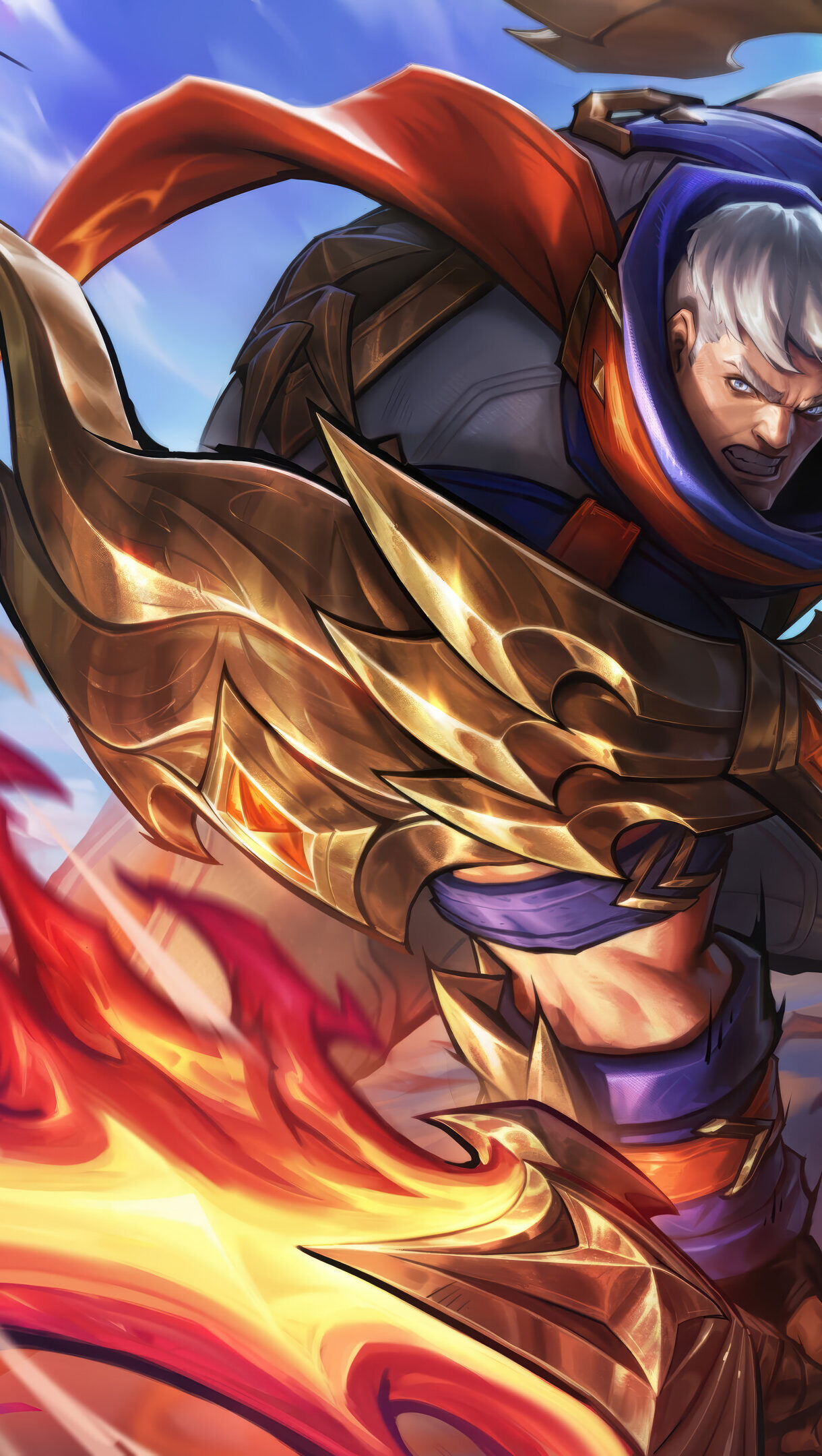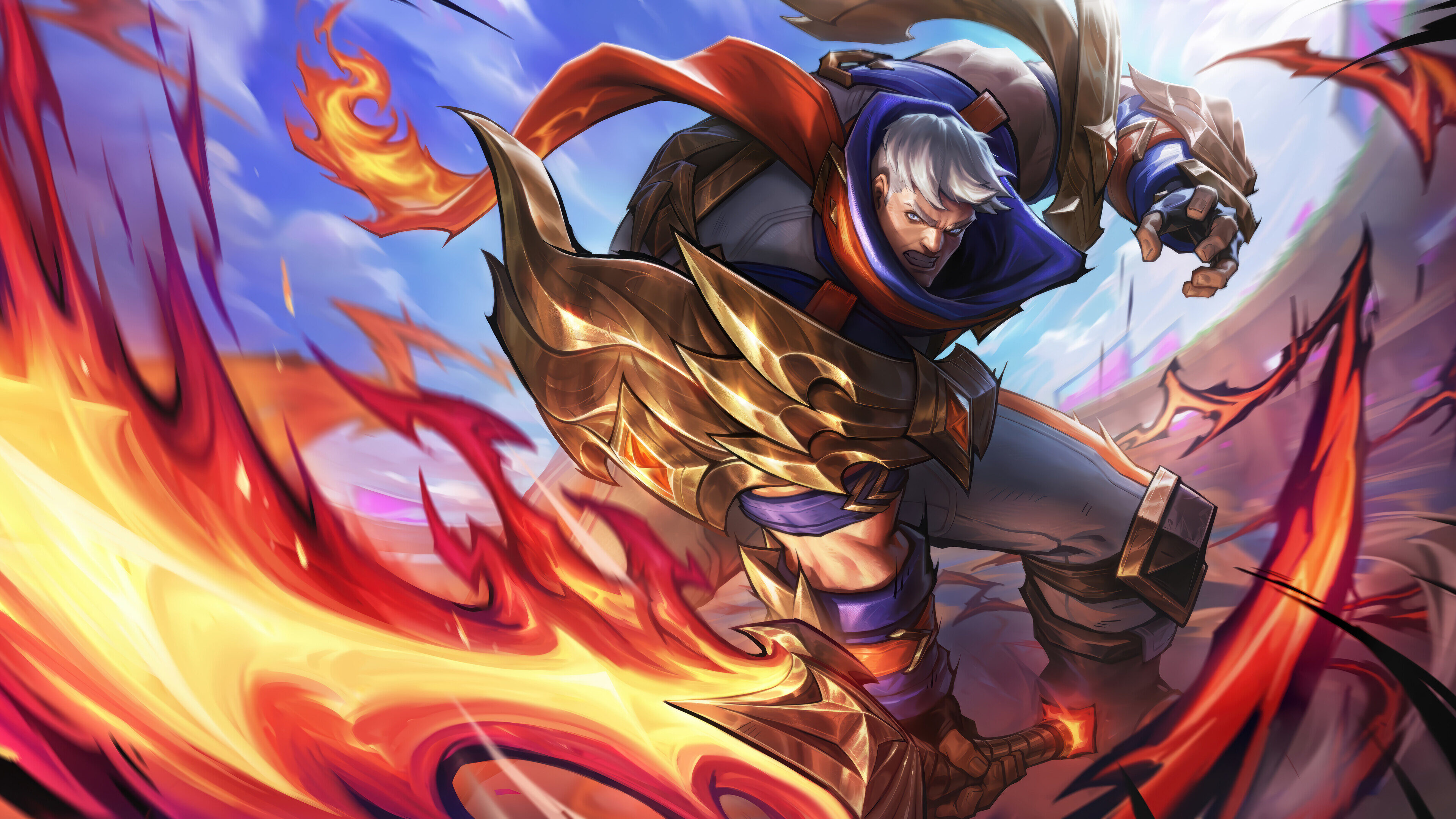 An electrifying 4K wallpaper showcasing Garen from League of Legends in his Soul Fighter skin, lunging intensely amidst a chaotic swirl of fiery energy against a vibrant sky. His gleaming golden armor and fierce, determined expression are dramatically highlighted by the powerful red and orange flames engulfing the foreground.