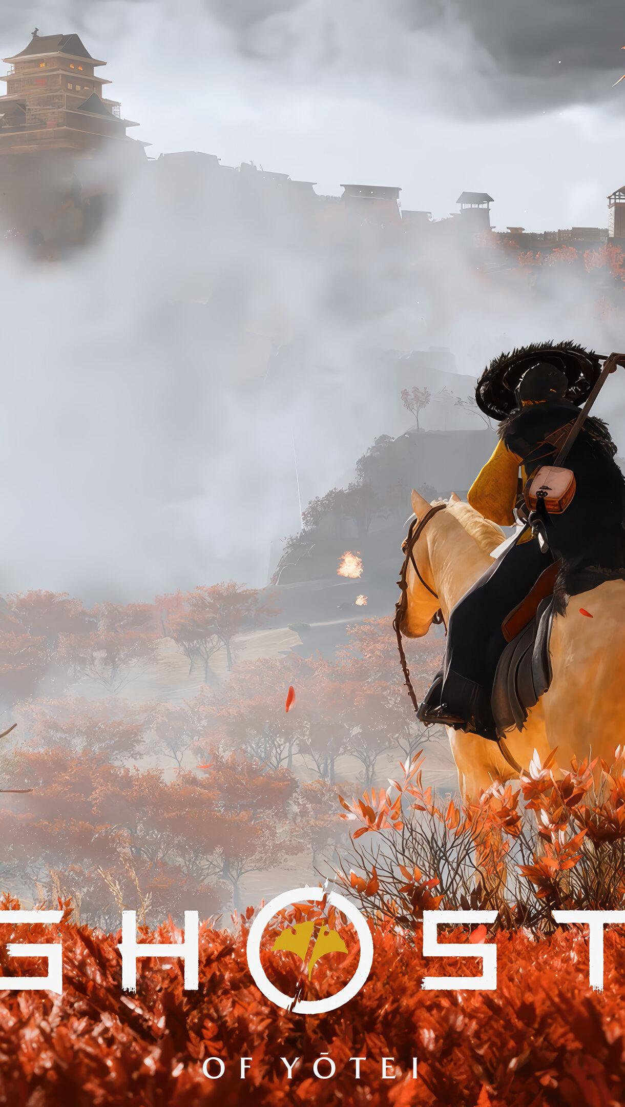 An epic 4K wallpaper captures the Ghost of Yotei, a lone samurai on horseback, traversing a vibrant, mist-shrouded autumn landscape. Brilliant scarlet foliage frames the scene, drawing the eye toward a majestic Japanese fortress partially veiled in fog atop a distant mountain, evoking a mood of solemn adventure.