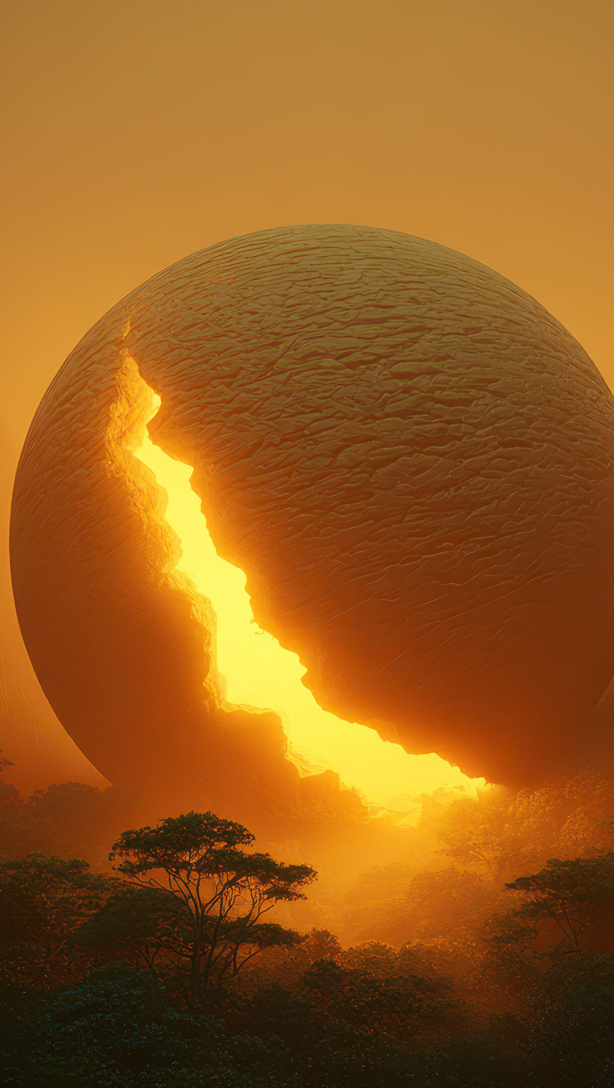A mystical 4K wallpaper showcasing a colossal, textured sphere splitting open in the center of a misty, mountainous valley, revealing an incandescent golden core. This radiant light permeates the dense, warm mist, illuminating the surrounding dark, verdant foliage and creating an ethereal, dramatic glow.