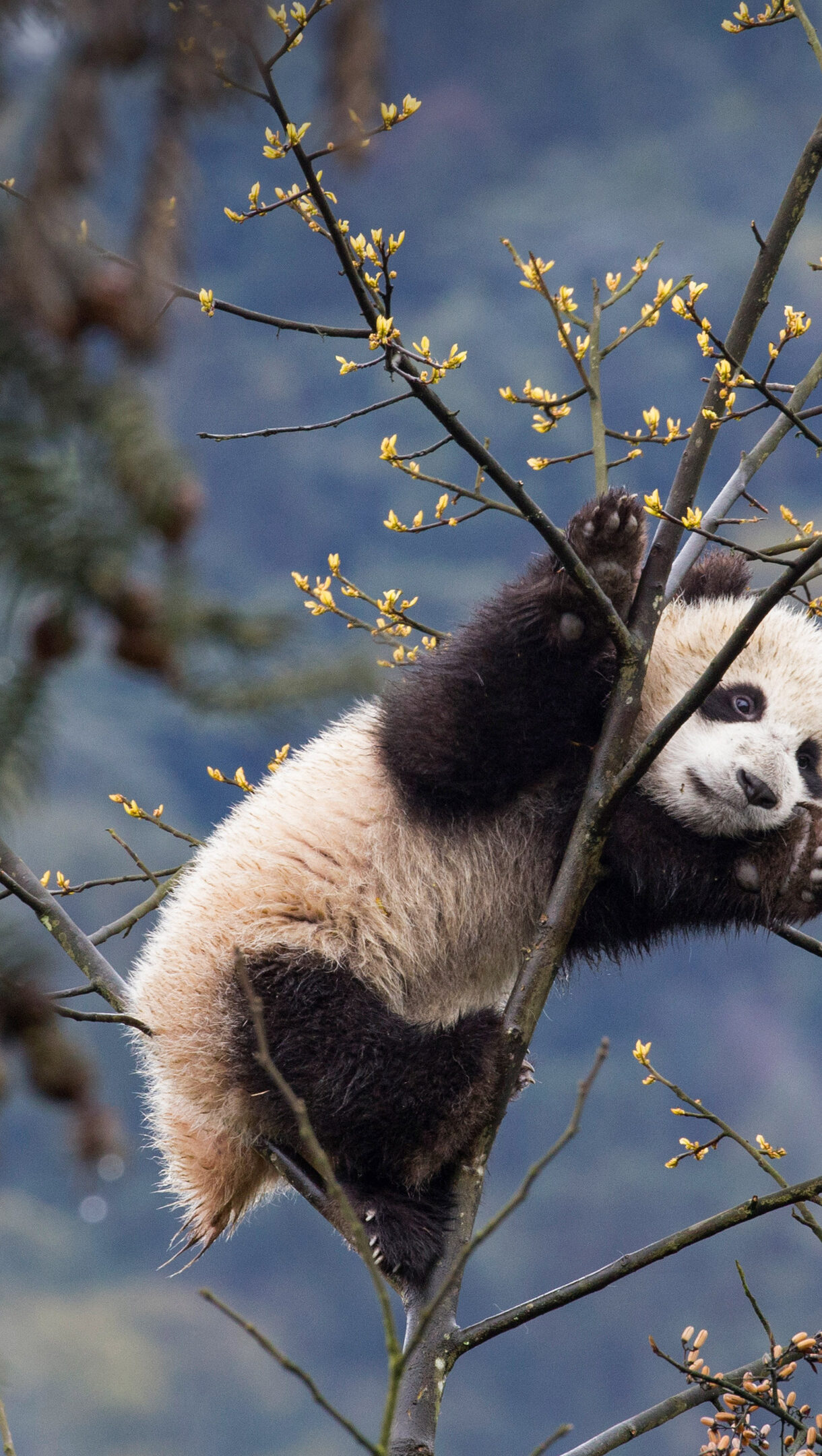 A captivating 4K wallpaper captures a giant panda cub midway through climbing a tree, set within the lush environment of the Bifengxia Panda Base in Sichuan, China. The cub's fluffy black and white fur stands out against the delicate yellow-green buds of the branches it grips, creating a tender and hopeful mood against the soft, distant blue of the landscape.