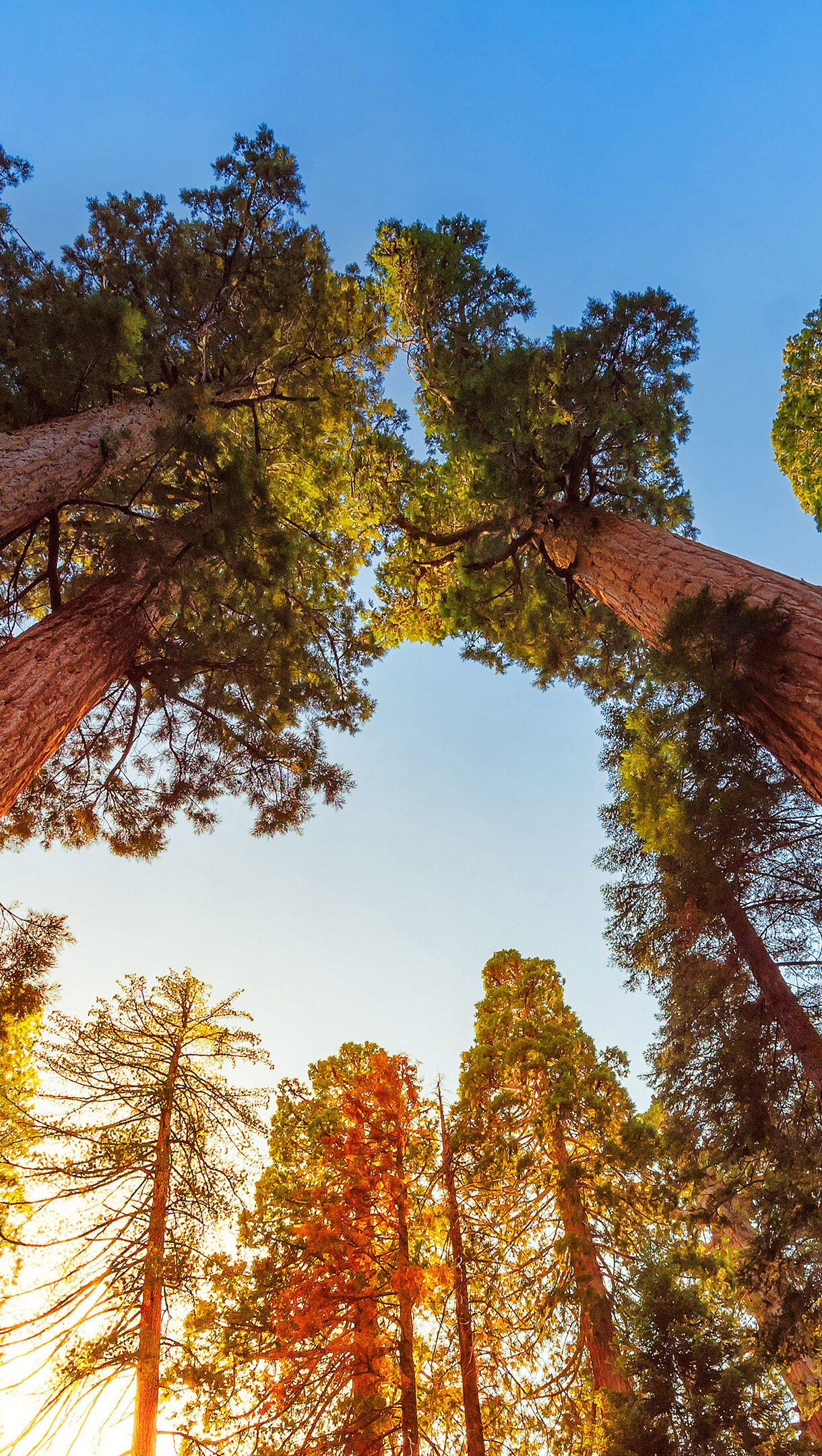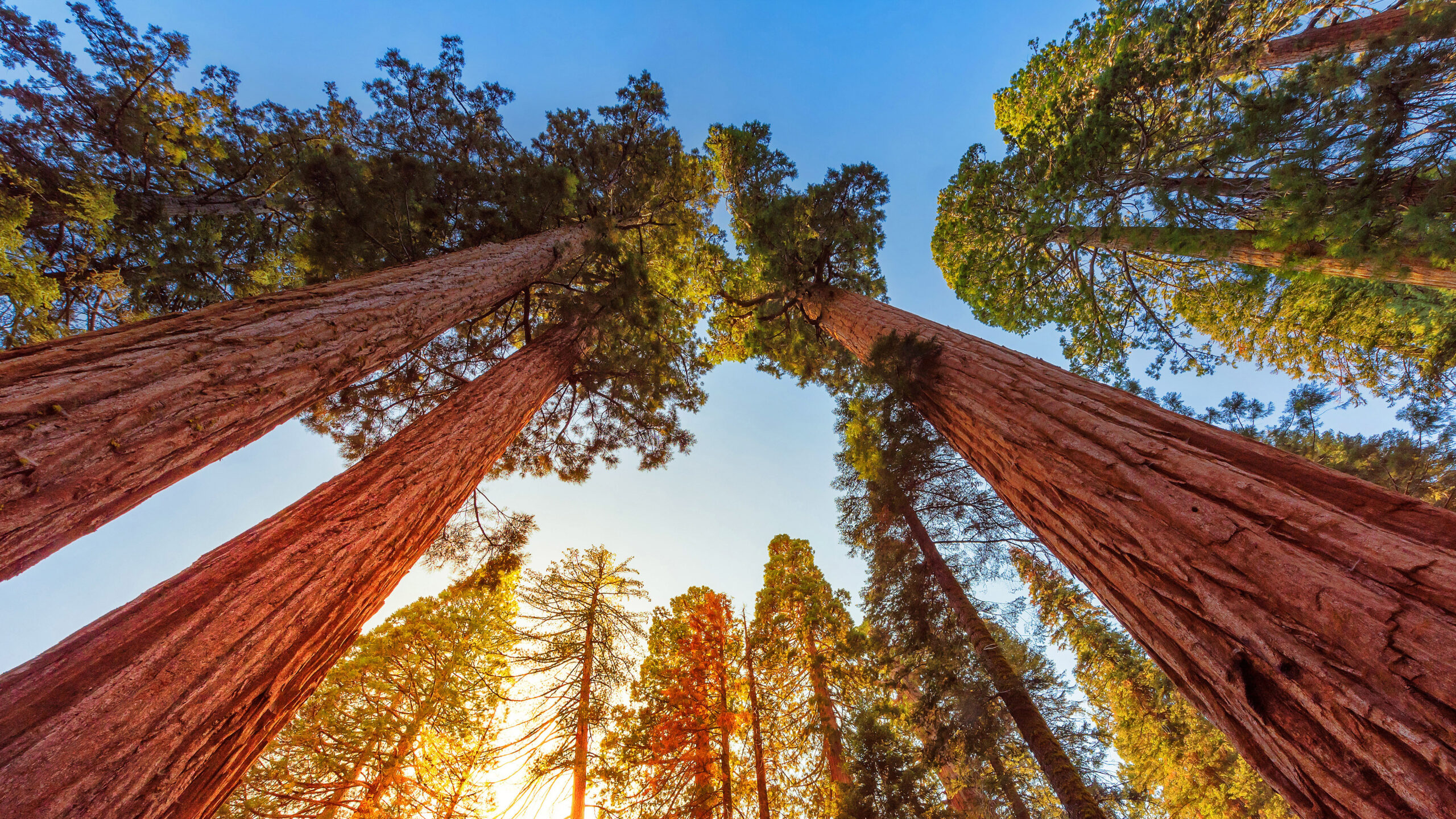 An immersive 4K wallpaper captures giant Sequoia trees towering upwards against a clear blue sky. Golden sunlight bathes their massive, textured reddish-brown trunks and green foliage, creating a warm, majestic glow against the serene azure.