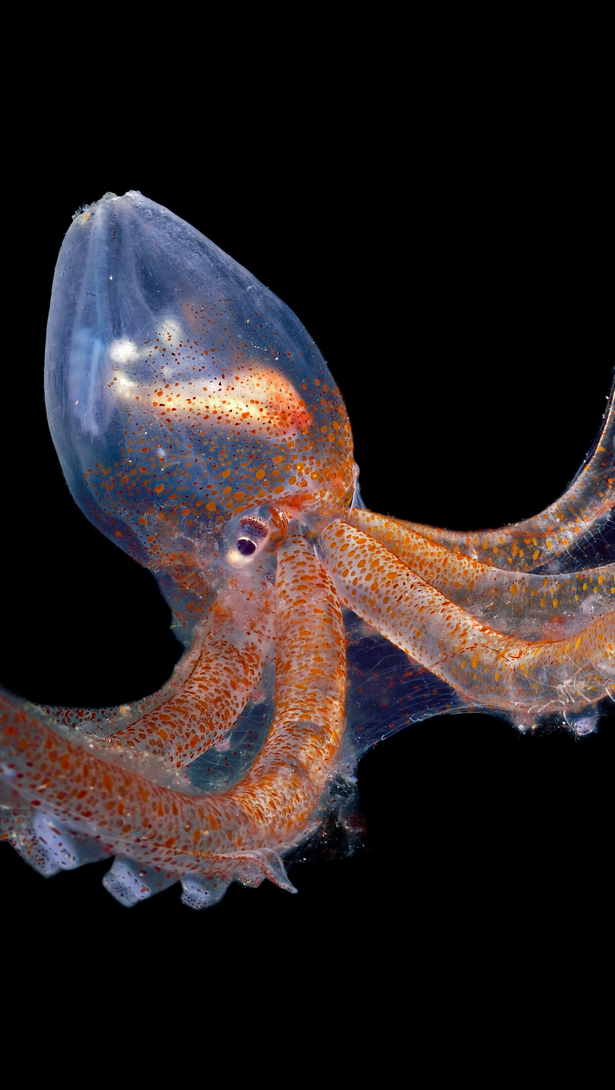 An ethereal 4K wallpaper revealing a translucent glass octopus swimming gracefully in the vast darkness of the Atlantic Ocean's deep sea. Its ghostly, clear body, speckled with delicate orange-red chromatophores, glows softly against the inky black backdrop, highlighting its ethereal beauty.