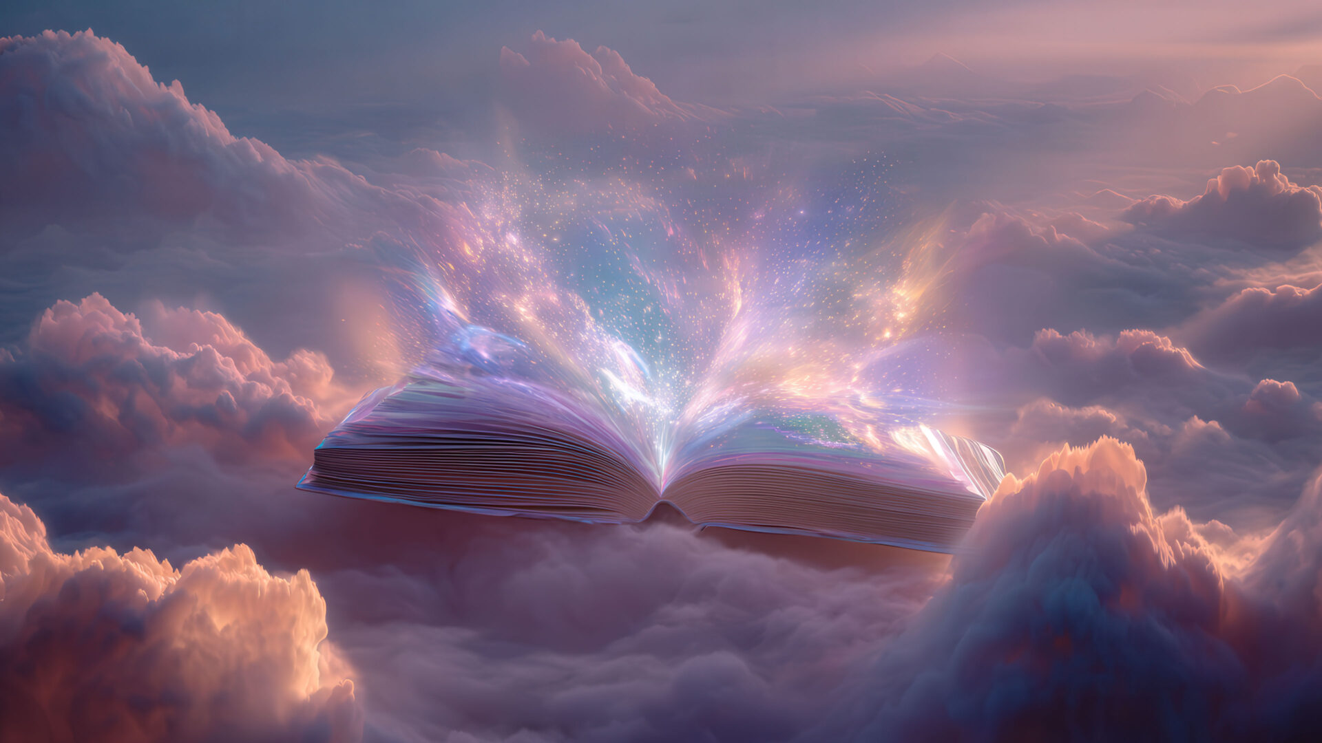 A magical 4K wallpaper of an open book floating amidst soft, dreamy pink and purple clouds high above the earth. Brilliant light and shimmering sparks erupt from the book's pages, casting a vibrant, ethereal glow across the mystical sky.