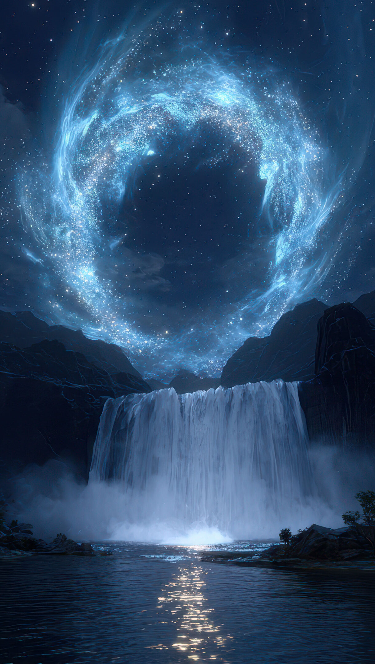 An ethereal 4K wallpaper captures a glowing crystal portal hovering above a majestic waterfall, nestled within dark, imposing mountains at night. Its vibrant blue, starlit energy illuminates the cascading water below, creating shimmering reflections on the tranquil pool and enhancing the magical, serene ambiance of the nocturnal landscape.
