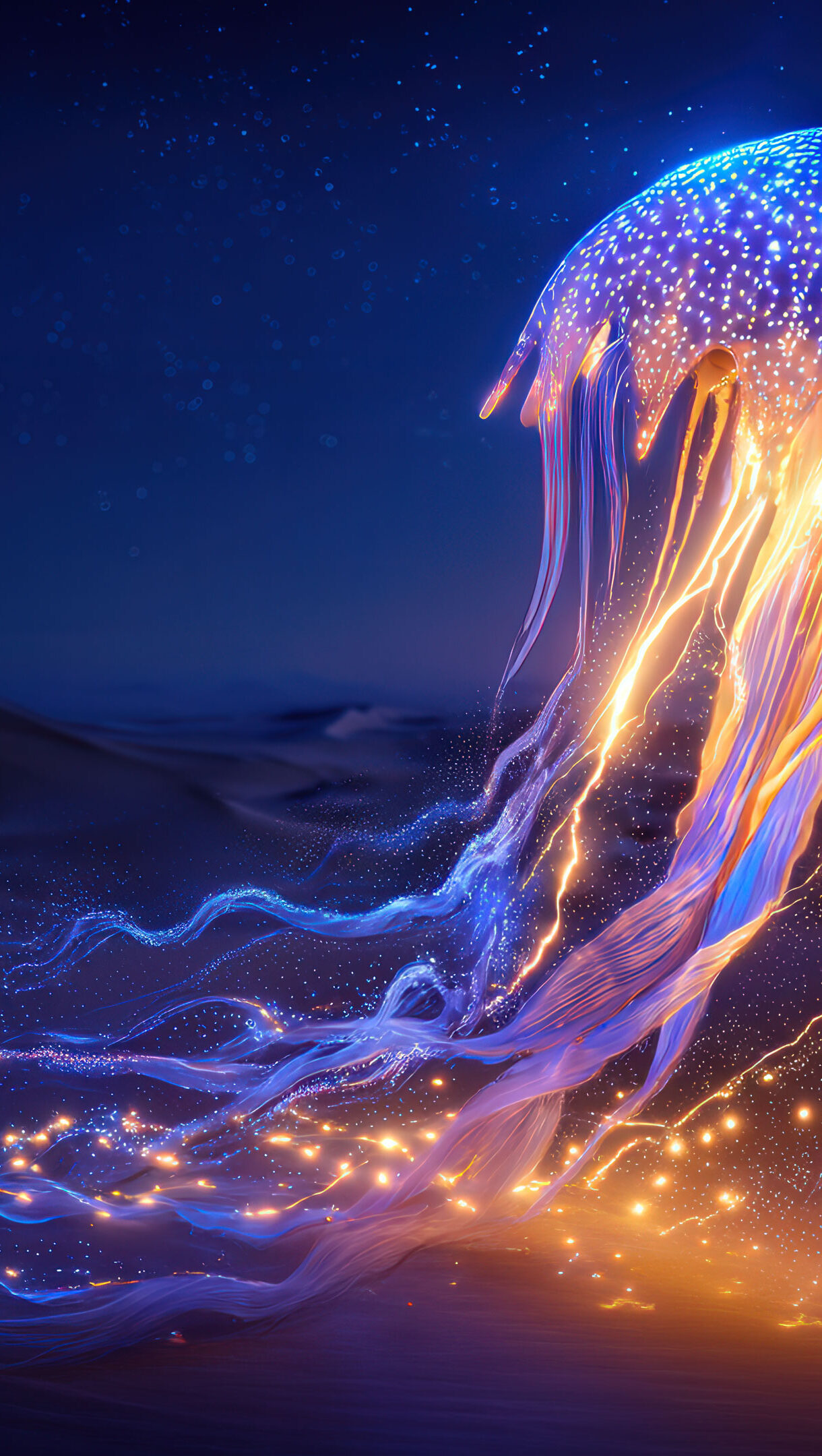 A surreal 4K wallpaper featuring a glowing jellyfish floating above a vast desert landscape at twilight. The bioluminescent creature emits radiant blues and purples, casting an ethereal glow on the sand dunes beneath a moody, star-speckled sky.