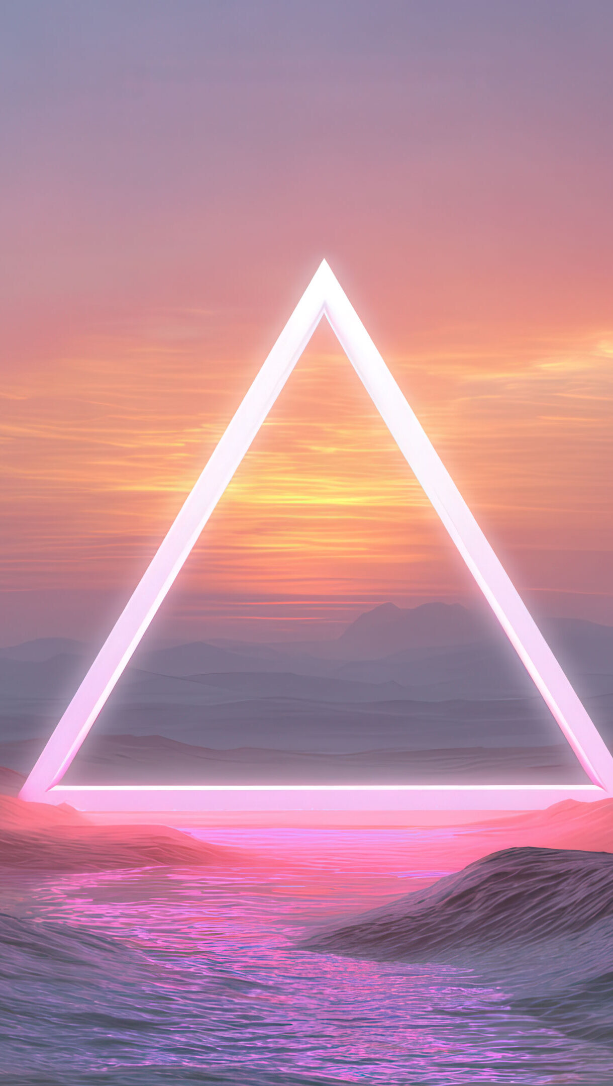 A vibrant 4K wallpaper showcasing a large, glowing neon triangle centered in an abstract landscape of textured waves and distant peaks under a gradient sky. The intense light of the triangle reflects vividly on the rippling surface, creating a surreal atmosphere against the warm hues of dawn or dusk.