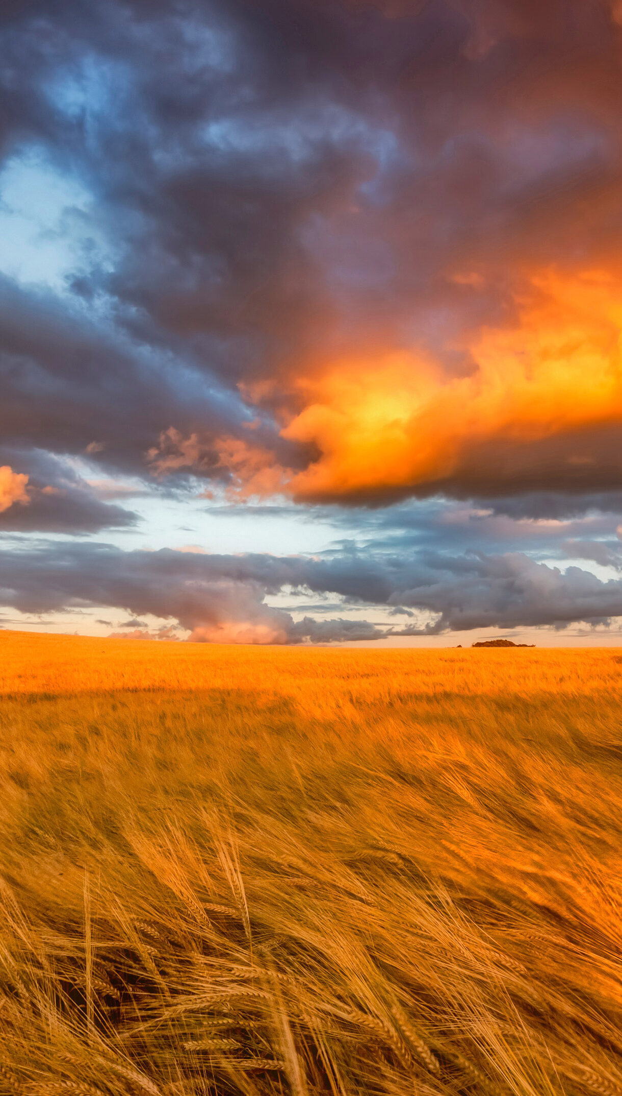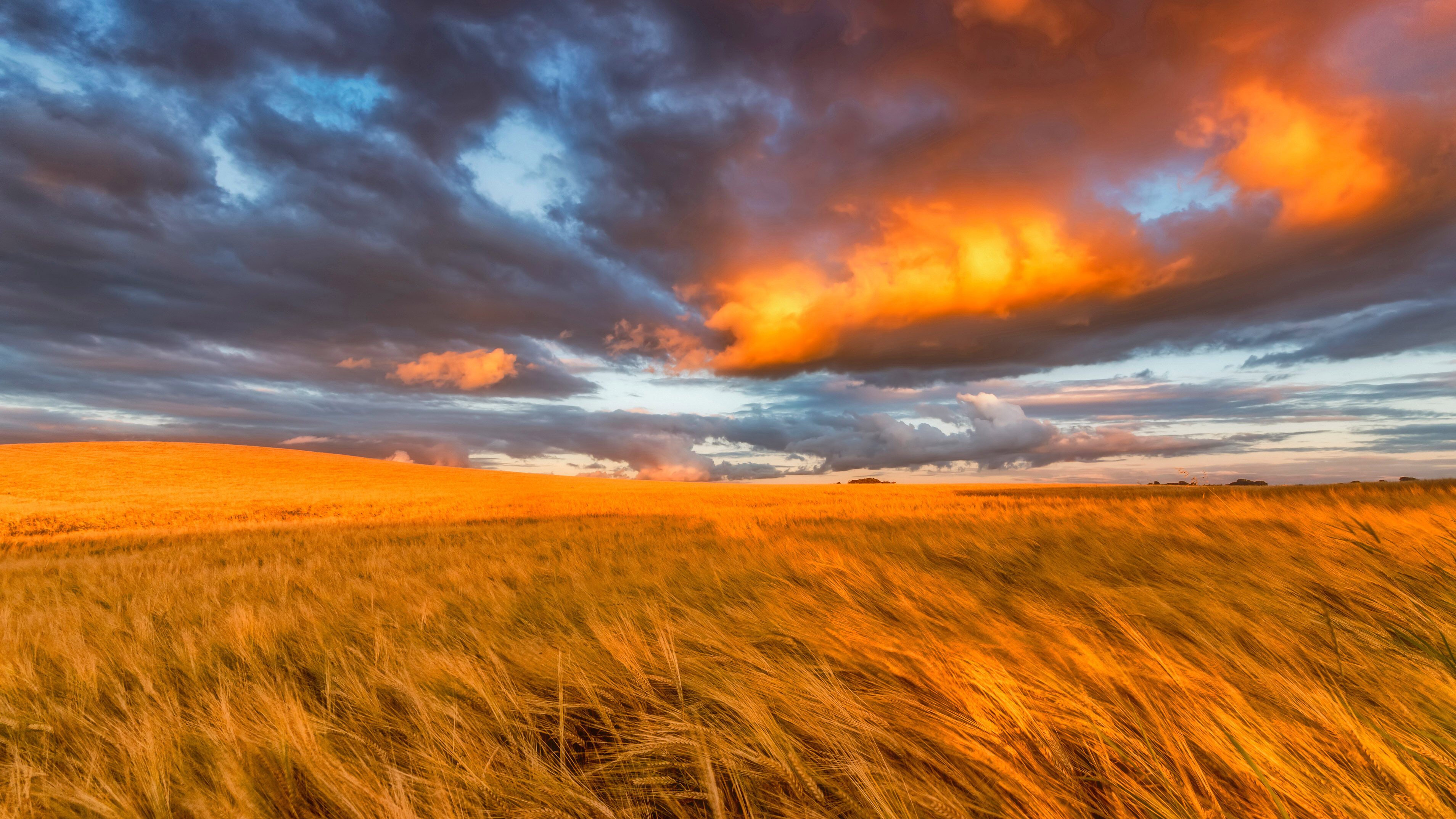An immersive 4K wallpaper presenting a vast golden barley field at sunset in East Lothian, Scotland. The field glows with the warm hues of the setting sun, beneath a dramatic sky ablaze with fiery oranges, deep blues, and brooding clouds.