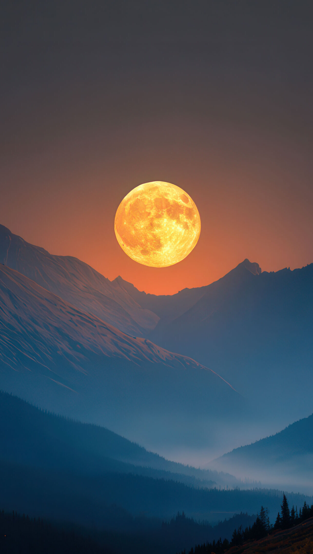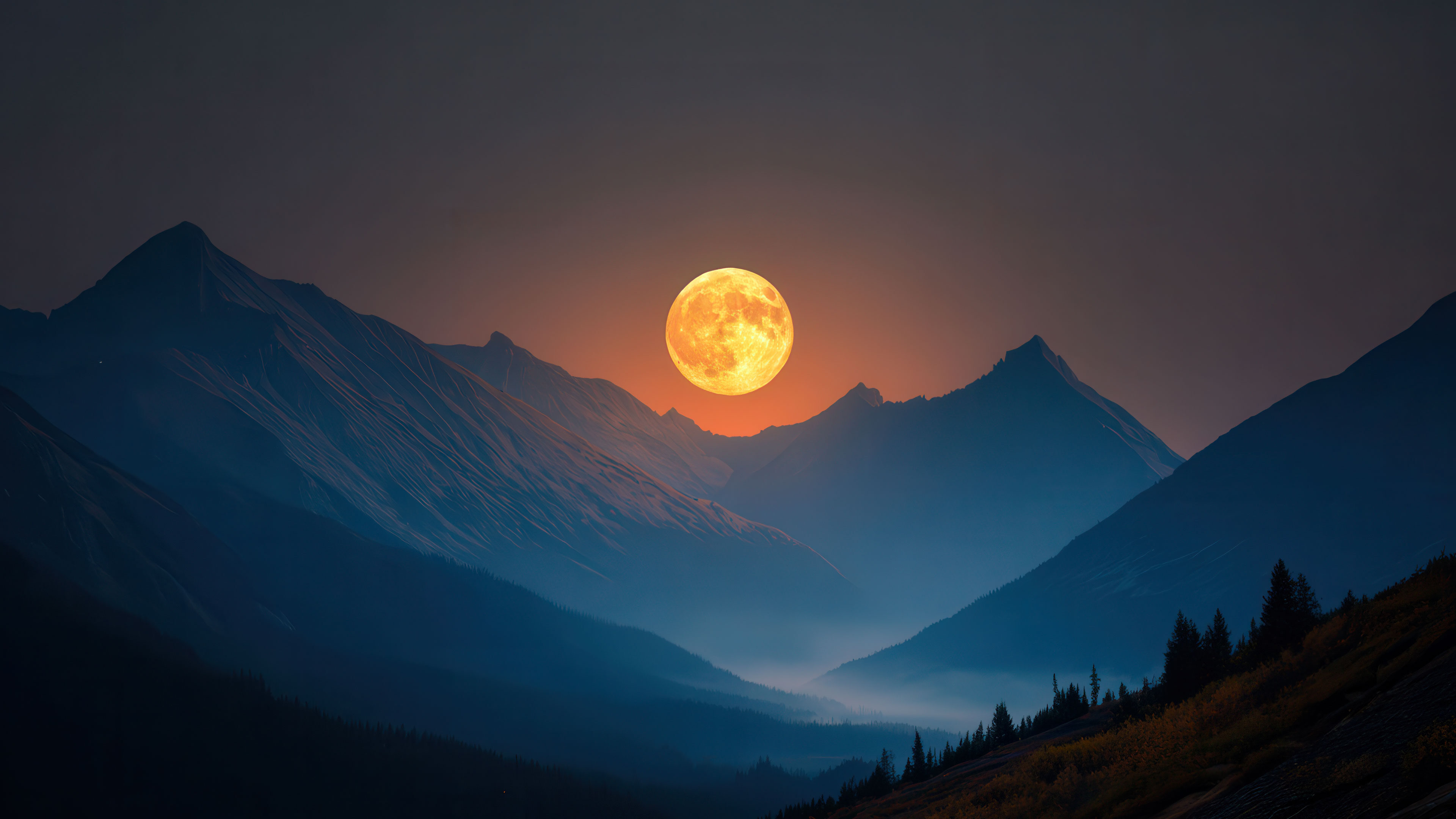 A grand 4K wallpaper showcases a vibrant golden full moon rising dramatically behind a sprawling vista of dark, majestic mountains. Its radiant, warm orange light illuminates the dark sky and casts a subtle glow on the upper mountain ridges, while the lower valleys are enveloped in a cool blue haze, conveying a profound sense of awe.