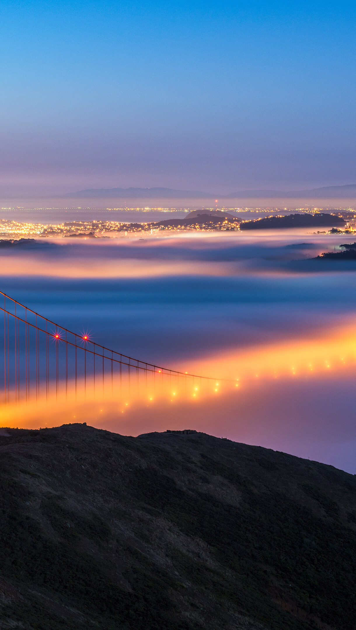 An ethereal 4K wallpaper of the Golden Gate Bridge at night, bathed in golden light as it pierces through dense fog over San Francisco Bay. The bridge's radiant towers and deck lights create a striking illuminated path, contrasting with the soft glow of distant city lights visible above and through the swirling mist.