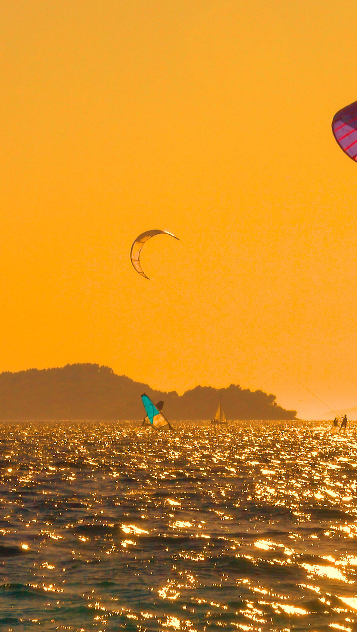 A breathtaking 4K wallpaper captures multiple kiteboarders and windsurfers actively enjoying the waters off Pelješac Peninsula, Croatia. The entire scene is bathed in the warm, intense glow of a golden sunset, making the water shimmer with countless bright reflections and silhouetting the dynamic figures against the radiant sky.