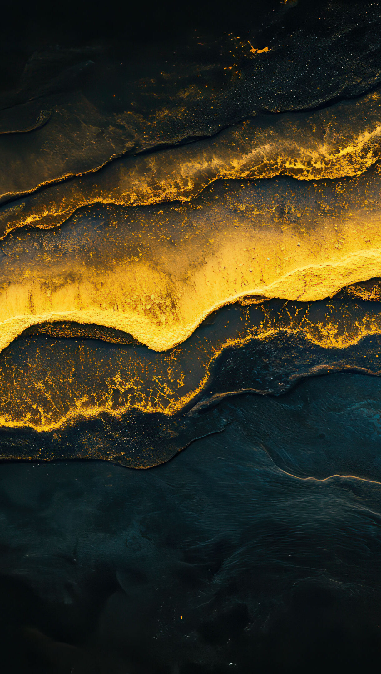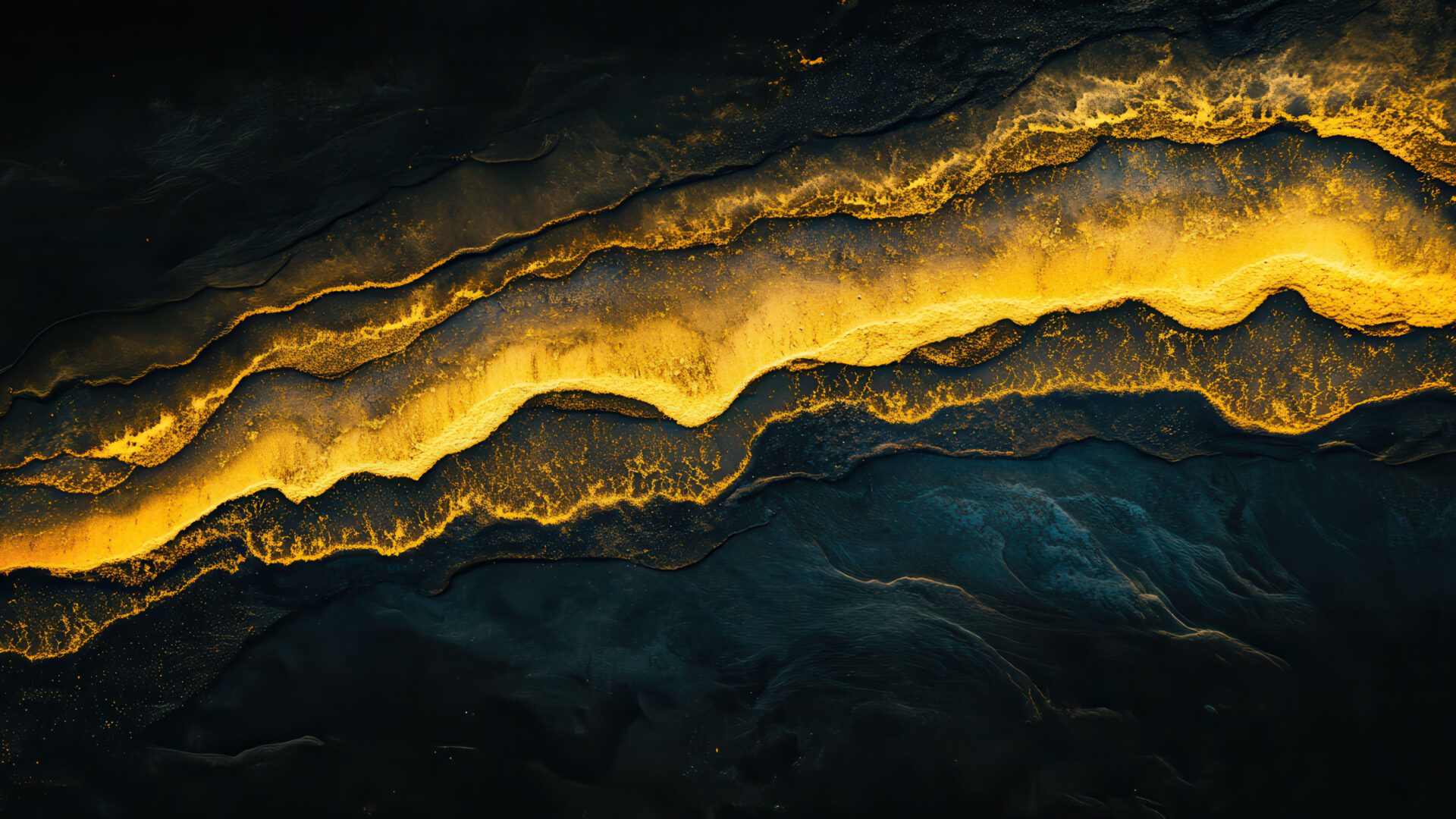 A stunning 4K wallpaper featuring elegant golden waves flowing across a deep, dark background. The contrast between the shimmering gold and the rich darkness creates a luxurious and mesmerizing visual effect, perfect for desktop or mobile screens.