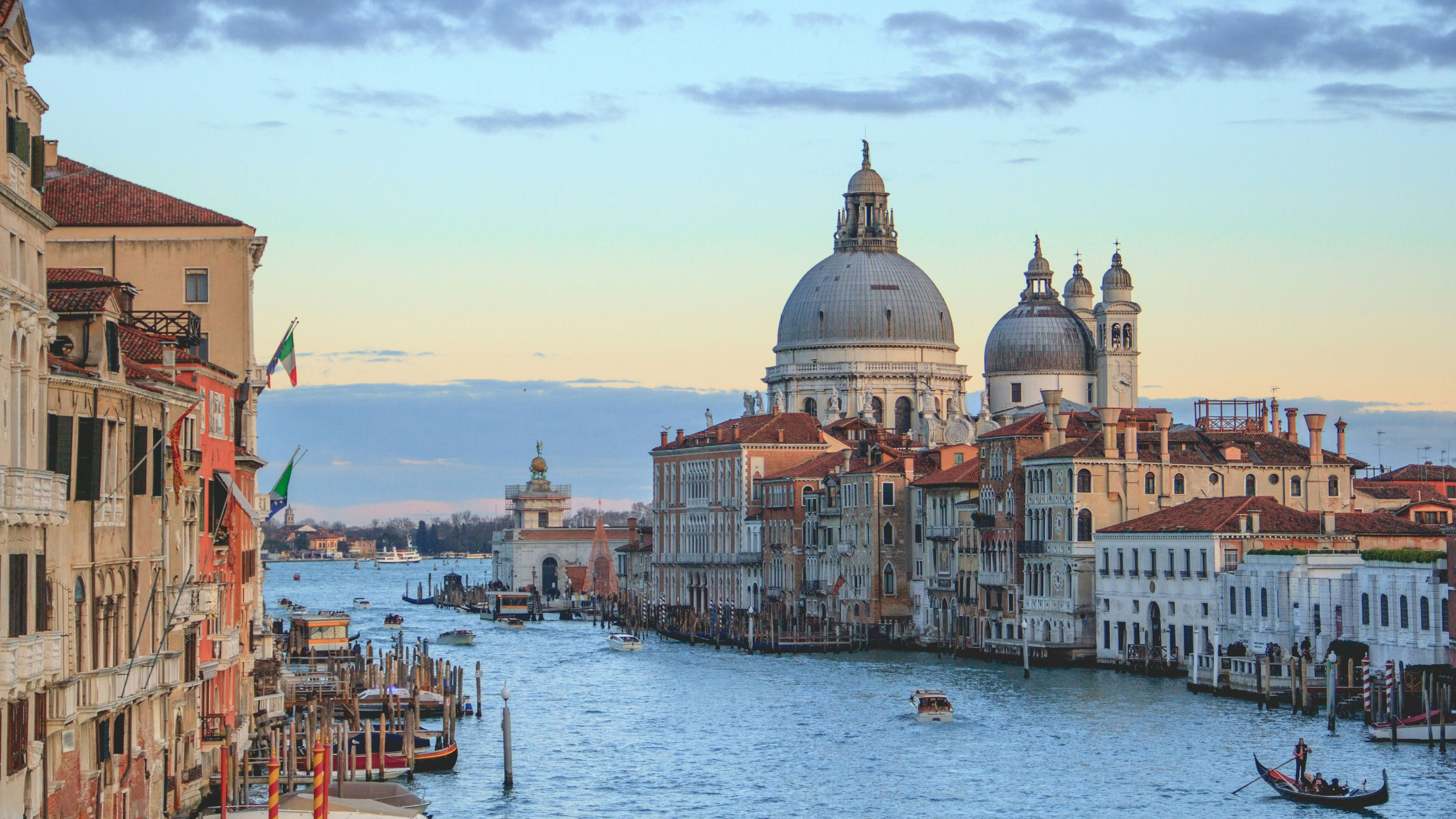 A breathtaking 4K wallpaper captures the enchanting beauty of the Grand Canal at sunset in Venice, Italy. The golden hues of the setting sun cast a warm glow over the tranquil water, illuminating the historic architecture and creating stunning reflections. Ideal for adding a touch of elegance to your desktop or mobile screen.
